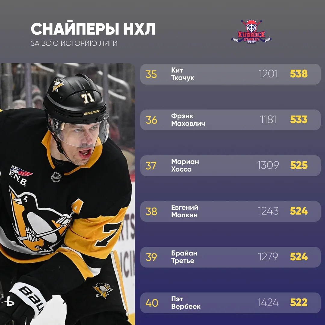 ⬆️ Евгений Малкин продолжает продвижение по списку снайперов за всю историю НХЛ