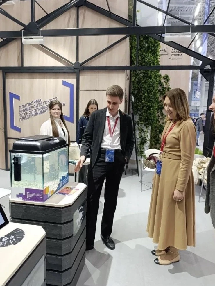 На стенде Платформы университетского технологического предпринимательства «Теплица стартапов» был представлен проект «Разработка технологии воспроизводства гамбузии», автором которого является студент биологического факультета Александр Савинов.