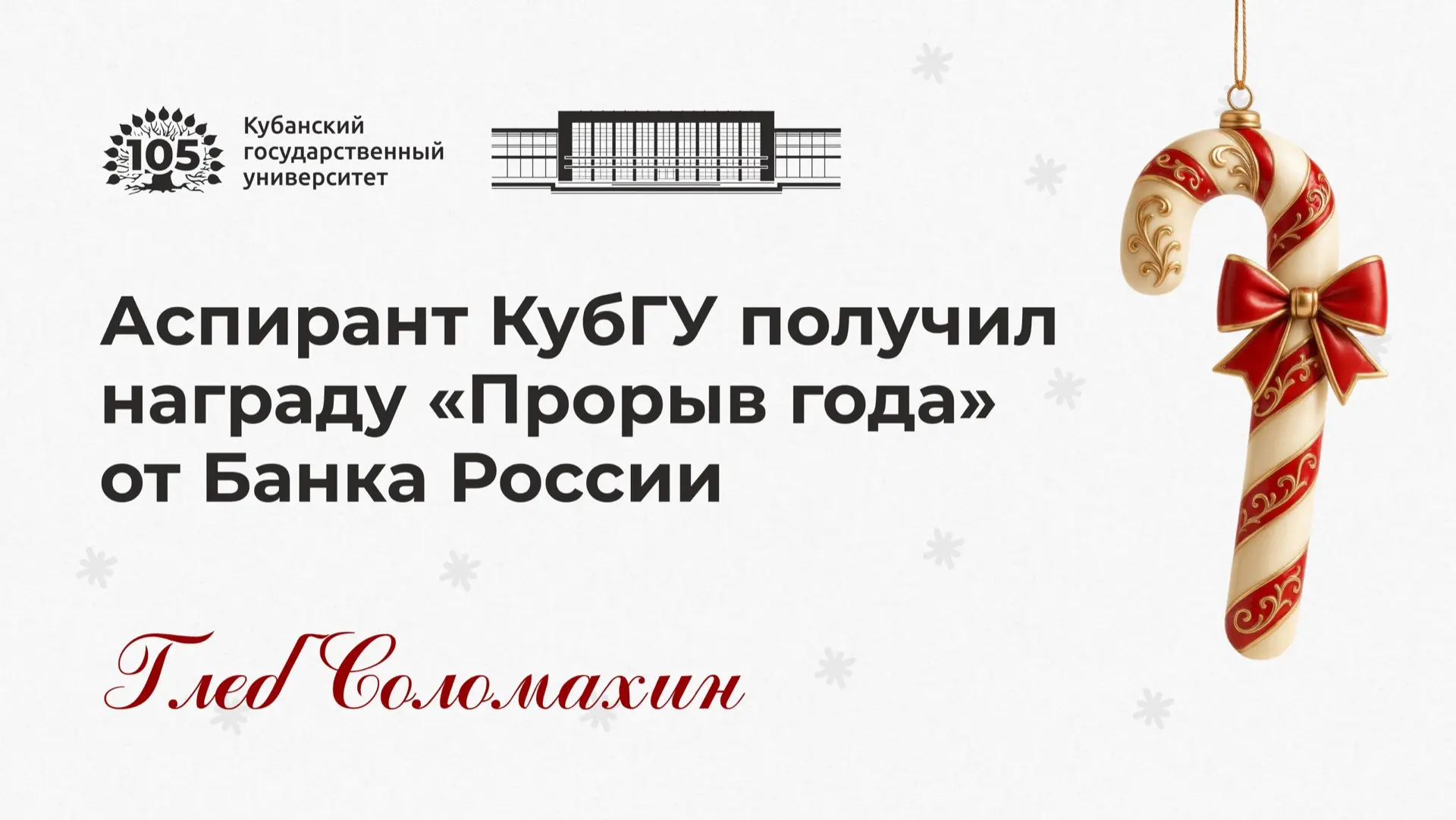 Аспирант кафедры экономического анализа, статистики и финансов КубГУ Глеб Соломахин получил награду «Прорыв года» от Банка России.