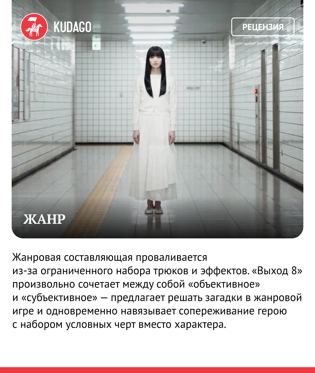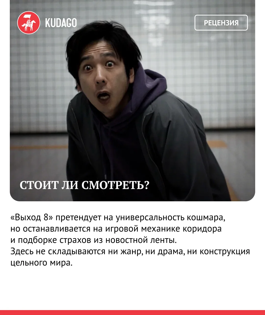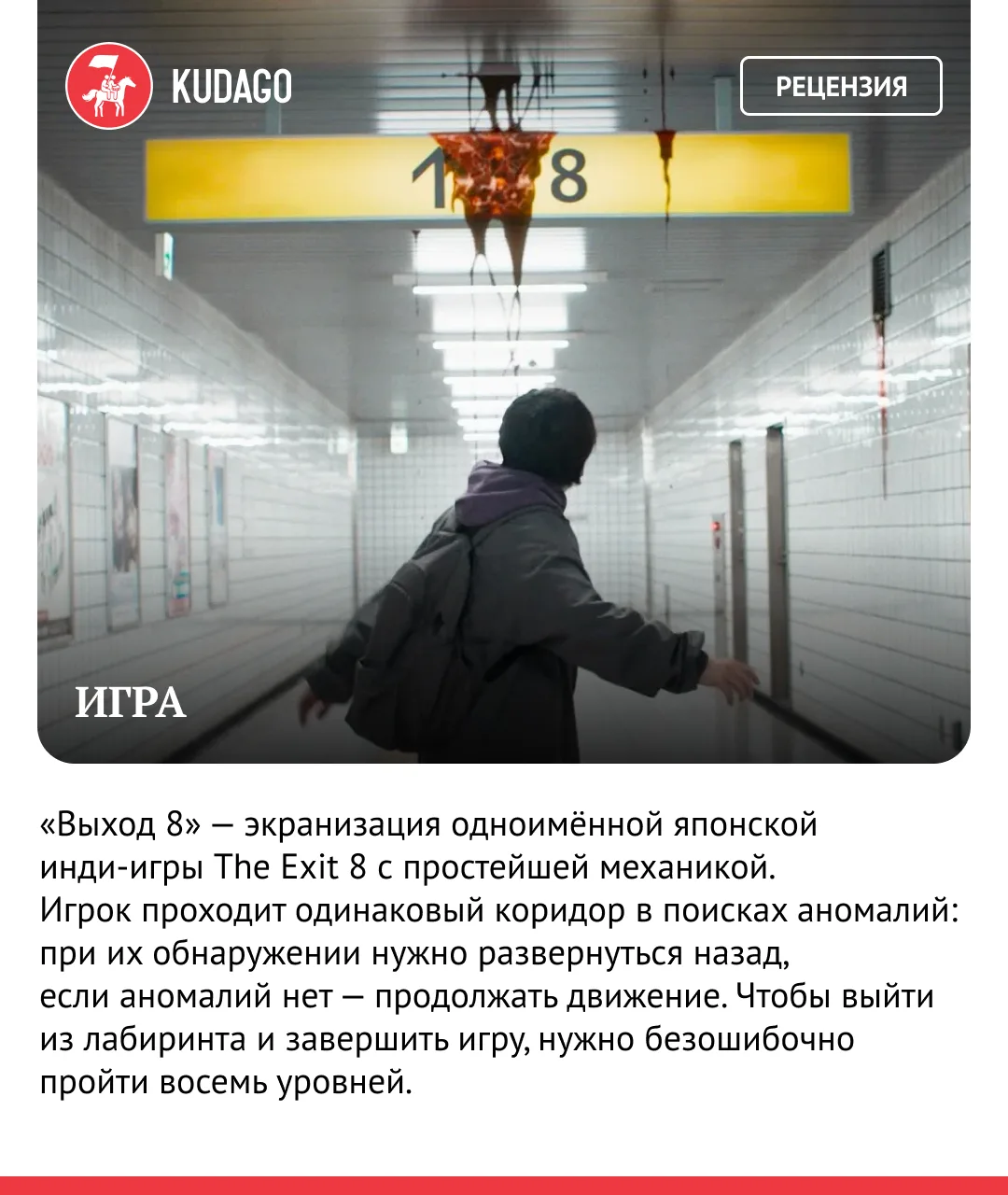 В начале осени после премьеры на Каннском кинофестивале в российский прокат вышла экранизация одноимённой японской игры «Выход 8». Картина уже успела разделить зрителей: одни хвалят её как стильный и напряжённый триллер с интересной игрой со зрителем, другие ругают за спорные сценарные решения и механику.