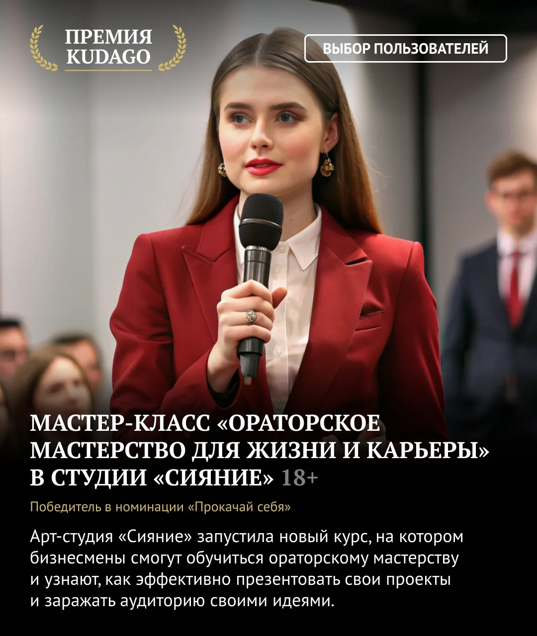 В номинации «Прокачай себя» победил мастер-класс «Ораторское мастерство для жизни и карьеры» в студии «Сияние».