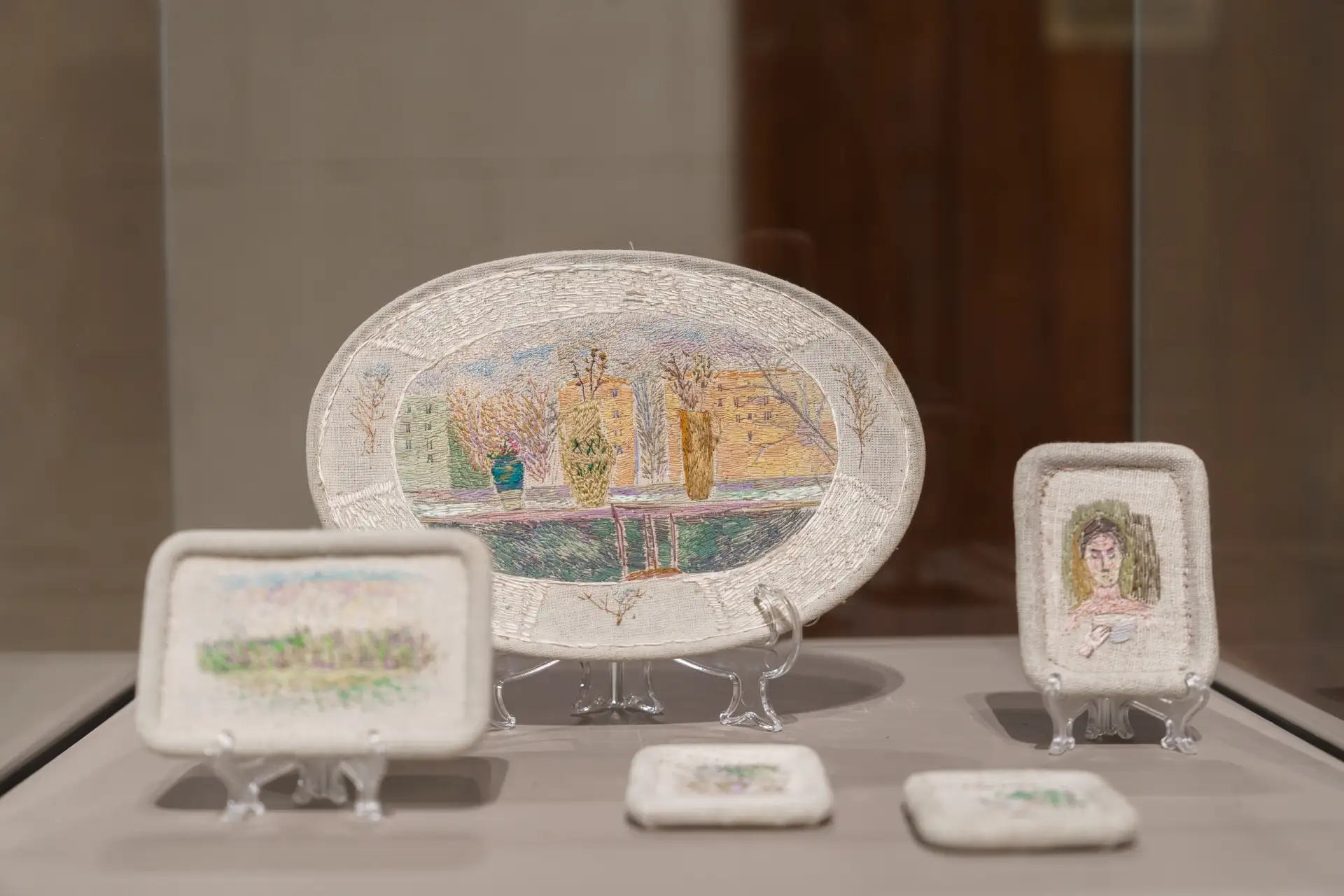 В экспозиции представлено более тридцати произведений 1970 — 1980-х годов. Обучение в Строгановском училище позволило художнице органично объединить принципы изобразительного и прикладного искусства с поэтическим восприятием мира. Она отмечала, что именно вышивка дала ей возможность прийти к художественным решениям, недоступным в масляной живописи и мозаике. Современники высоко ценили её метод, сравнивая его с непрерывным звучанием мелодии, а исследователи подчёркивали его решающую роль в формировании её наследия.