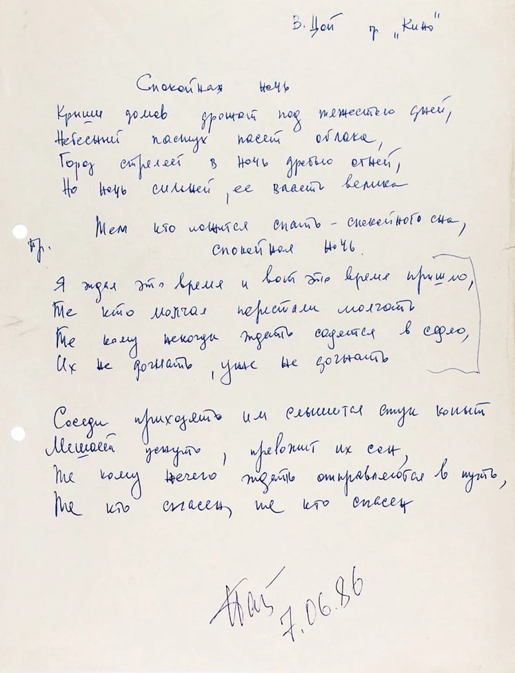 Рукопись легендарной песни «Спокойная ночь» группы «Кино» выставят на аукцион за 1 миллион рублей