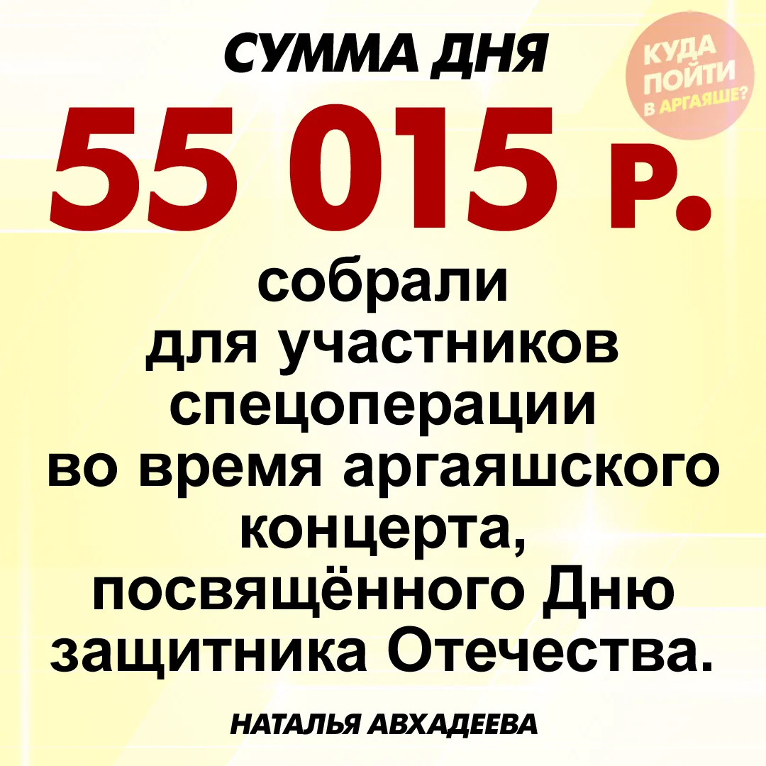 55015 рублей собрали для участников СВО во время концерта, посвящённого Дню защитника Отечества. Мероприятие прошло в Аргаяшском районном Доме культуры. Собранные средства будут направлены на приобретение гуманитарной помощи.