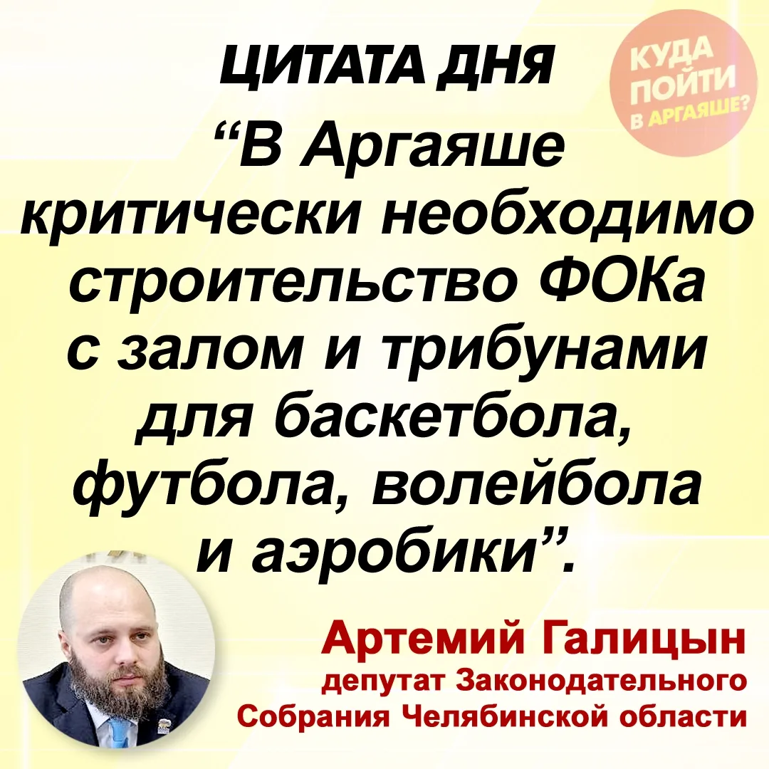💬 "В Аргаяше критически необходимо строительство ФОКа с залом и трибунами для баскетбола, футбола, волейбола и аэробики. Он должен стать спортивным центром для детей со всего района", - заявил Артемий Галицын на встрече в администрации Аргаяшского округа.