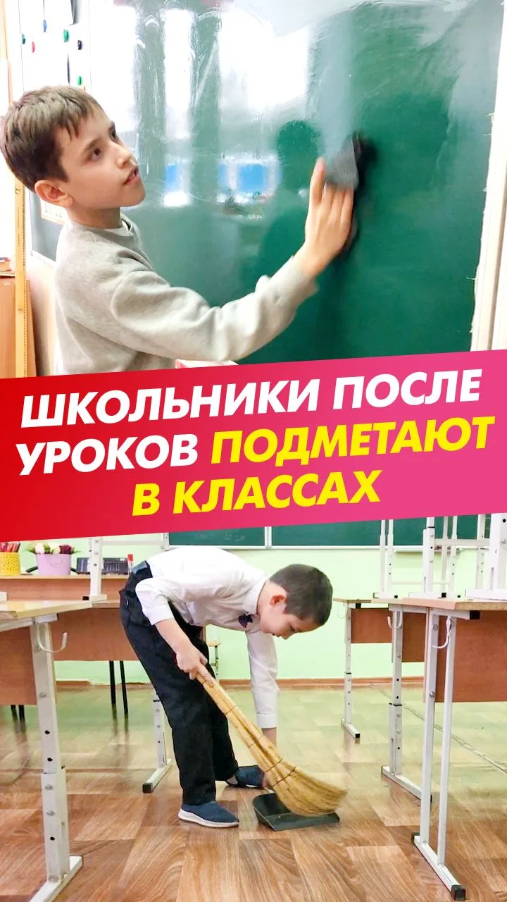 🧹 В нескольких начальных классах школы №1 дети дежурят после уроков - моют доску и подметают пол.