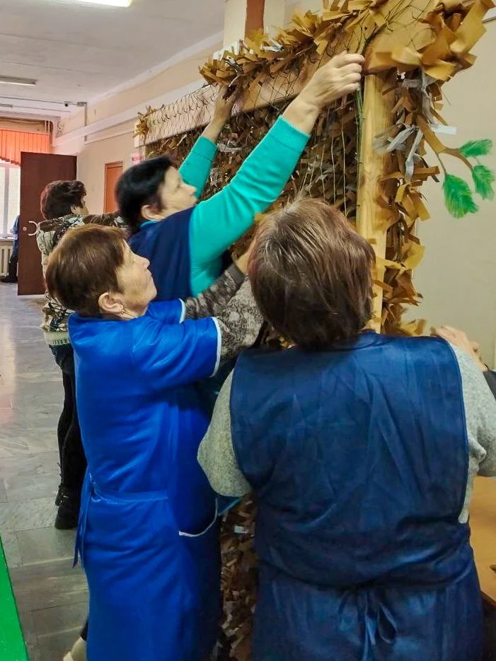 Холод - не повод отдыхать. В дни, когда из-за морозов отменяют занятия и в школе нет детей, уборщицы плетут маскировочные сети для участников специальной военной операции.