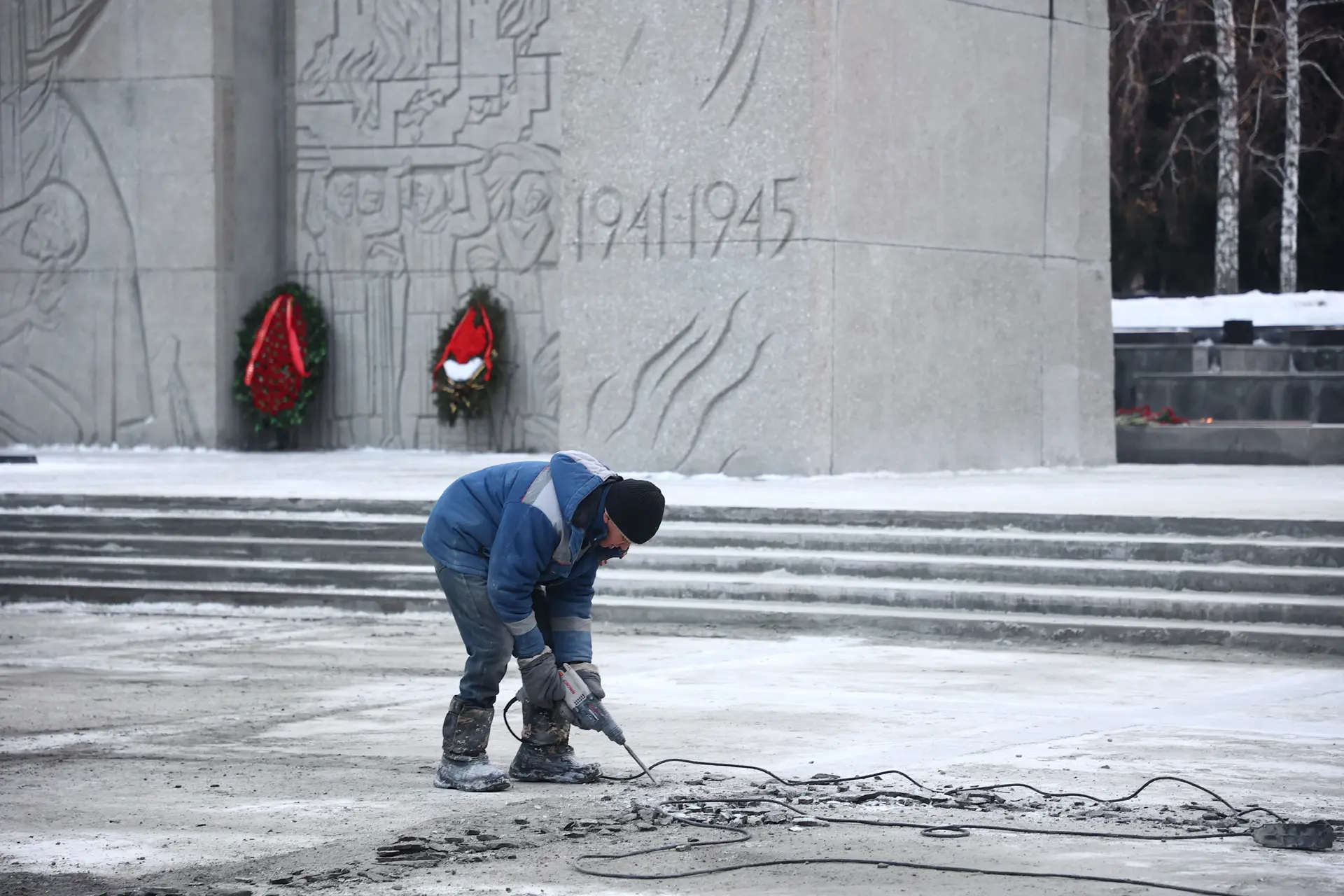 На площади у Вечного огня полностью заменено основание, устроена новая армированная плита, залит мозаичный бетон из белого цемента, выполнена заливка швов и первичная шлифовка. Весной завершим финальную обработку поверхности.