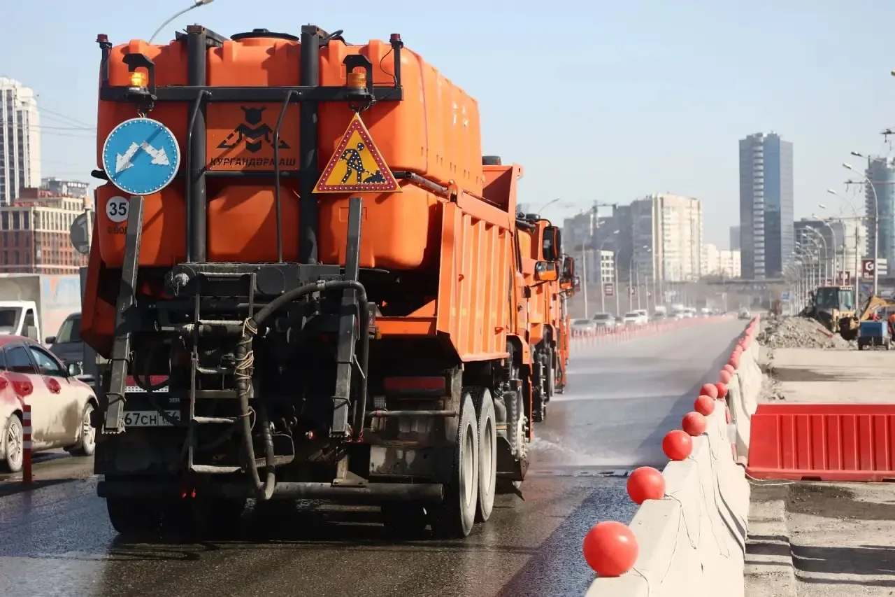 Со вчерашнего дня дорожно-эксплуатационные учреждения приступили к влажной уборке города: помыли почти 100 км дорог и тротуаров.