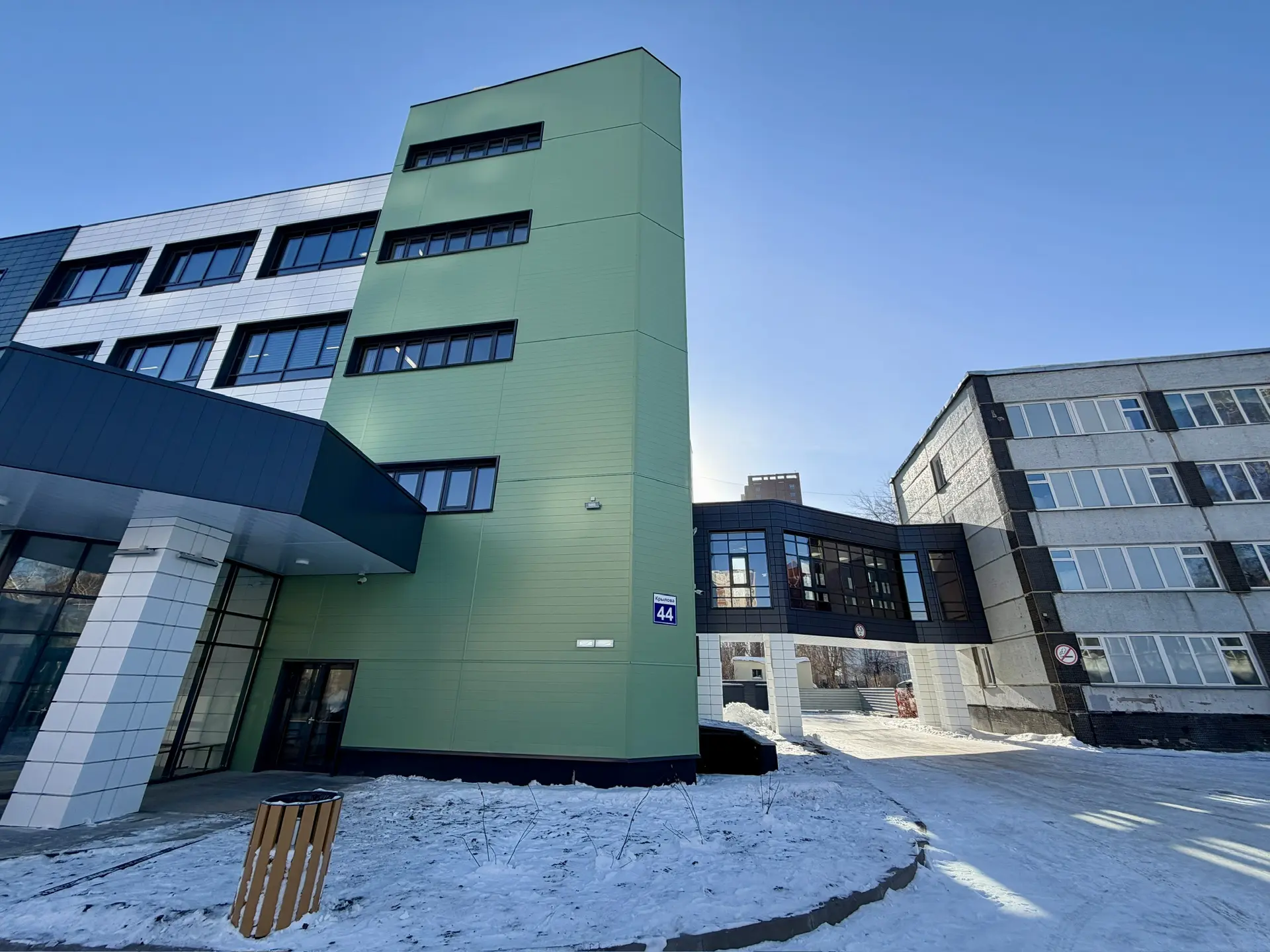 Четырёхэтажное здание соединено с основным корпусом тёплым переходом. Пространство рассчитано на старшую школу: профильные классы, лаборатории, зоны для проектной деятельности и развития инициатив. Созданы условия для углублённого обучения и подготовки к дальнейшему профессиональному выбору.
