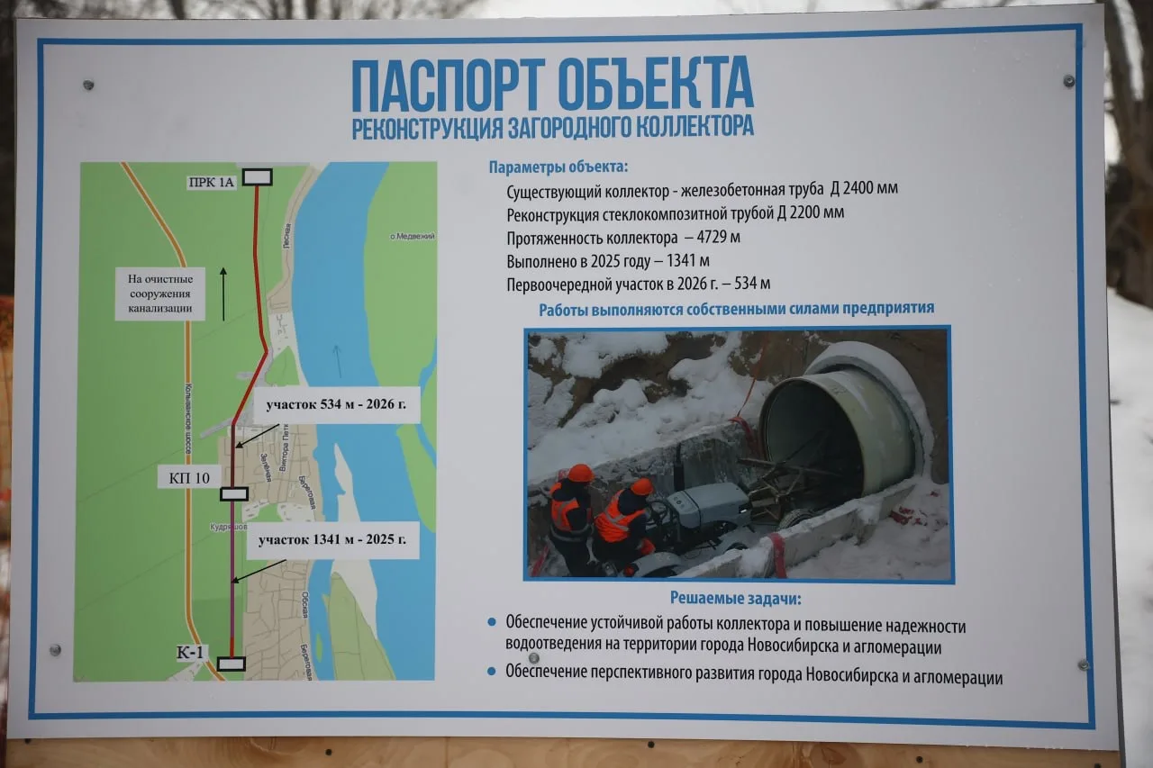Через коллектор ежедневно проходит порядка 450 тысяч кубометров сточных вод из Новосибирска и соседних муниципалитетов. Город растёт, развивается жилая застройка, увеличивается нагрузка на инфраструктуру, поэтому поддерживать такие объекты в нормативном состоянии — стратегическая задача.