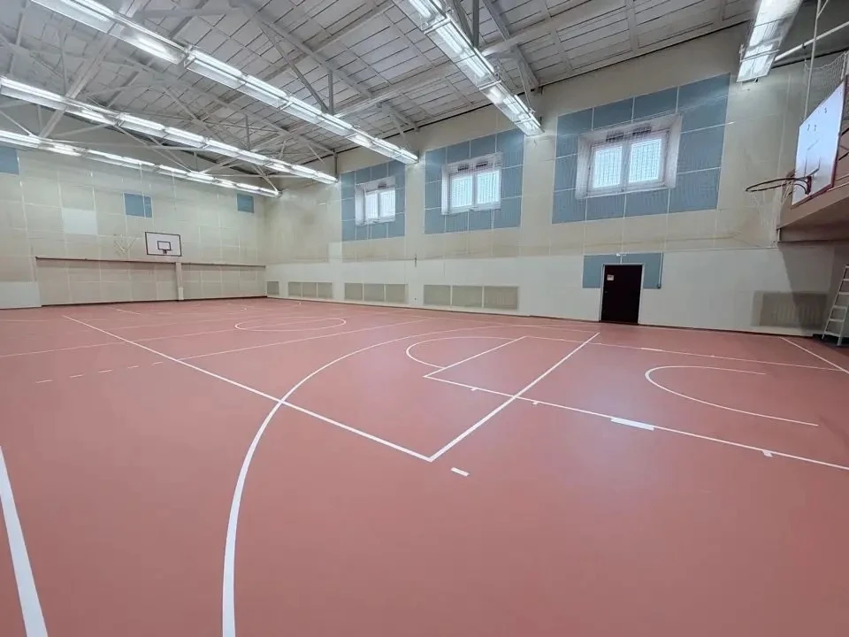 Здесь полностью заменили покрытие — вместо деревянного уложили современный спортивный линолеум, дополнительно усилили освещение игровой площадки.