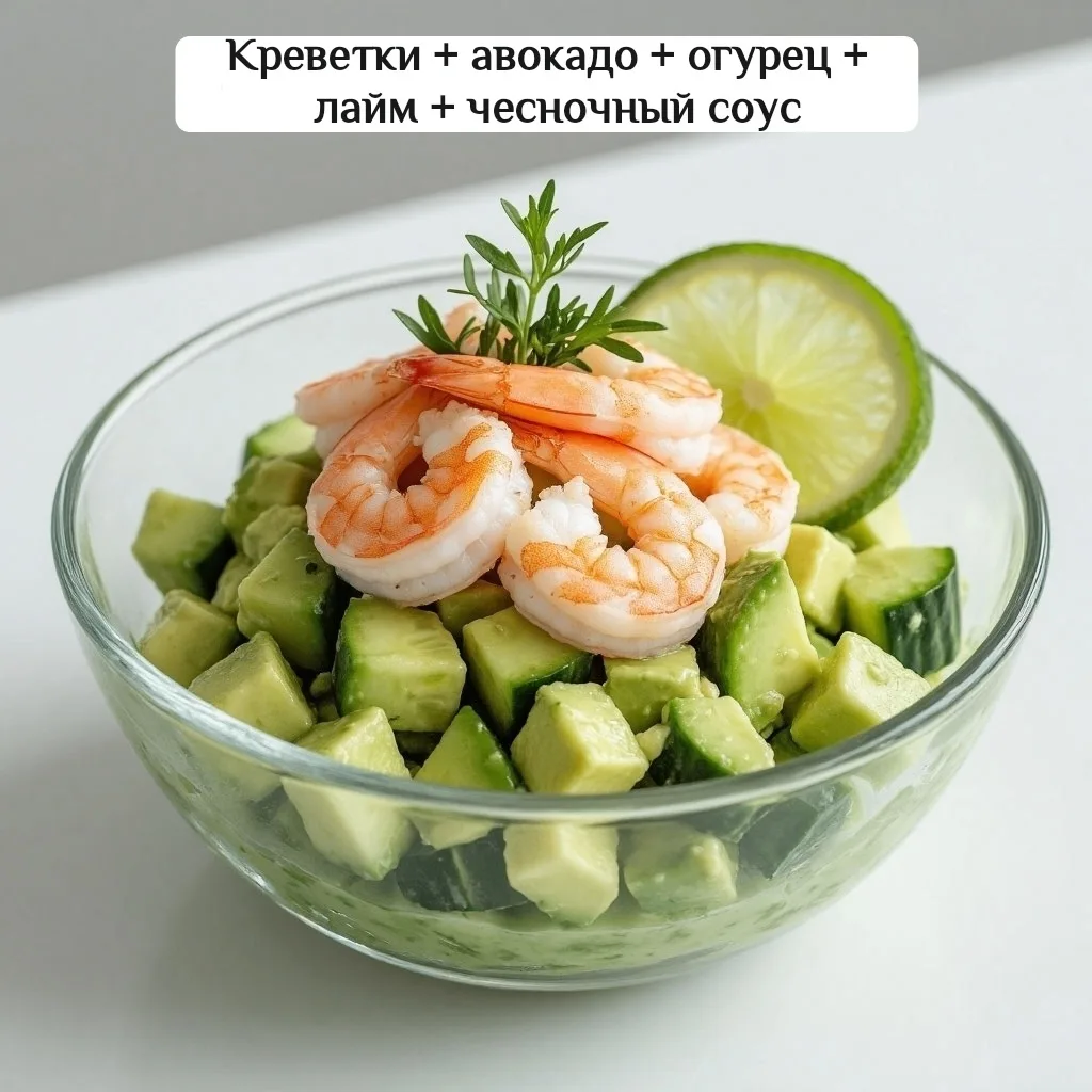 Креветки + авокадо + огурец + лайм + чесночный соус.