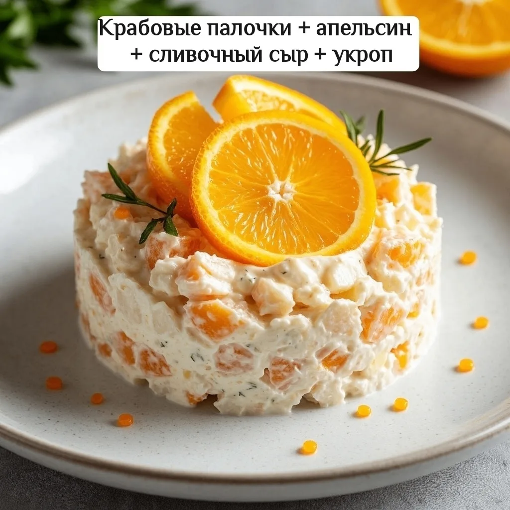 Крабовые палочки + апельсин + сливочный сыр + укроп.