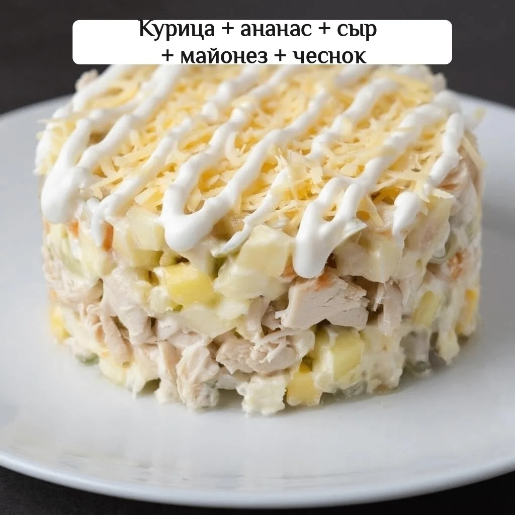 Тёртая курица + сыр + яйцо + майонез + чеснок.