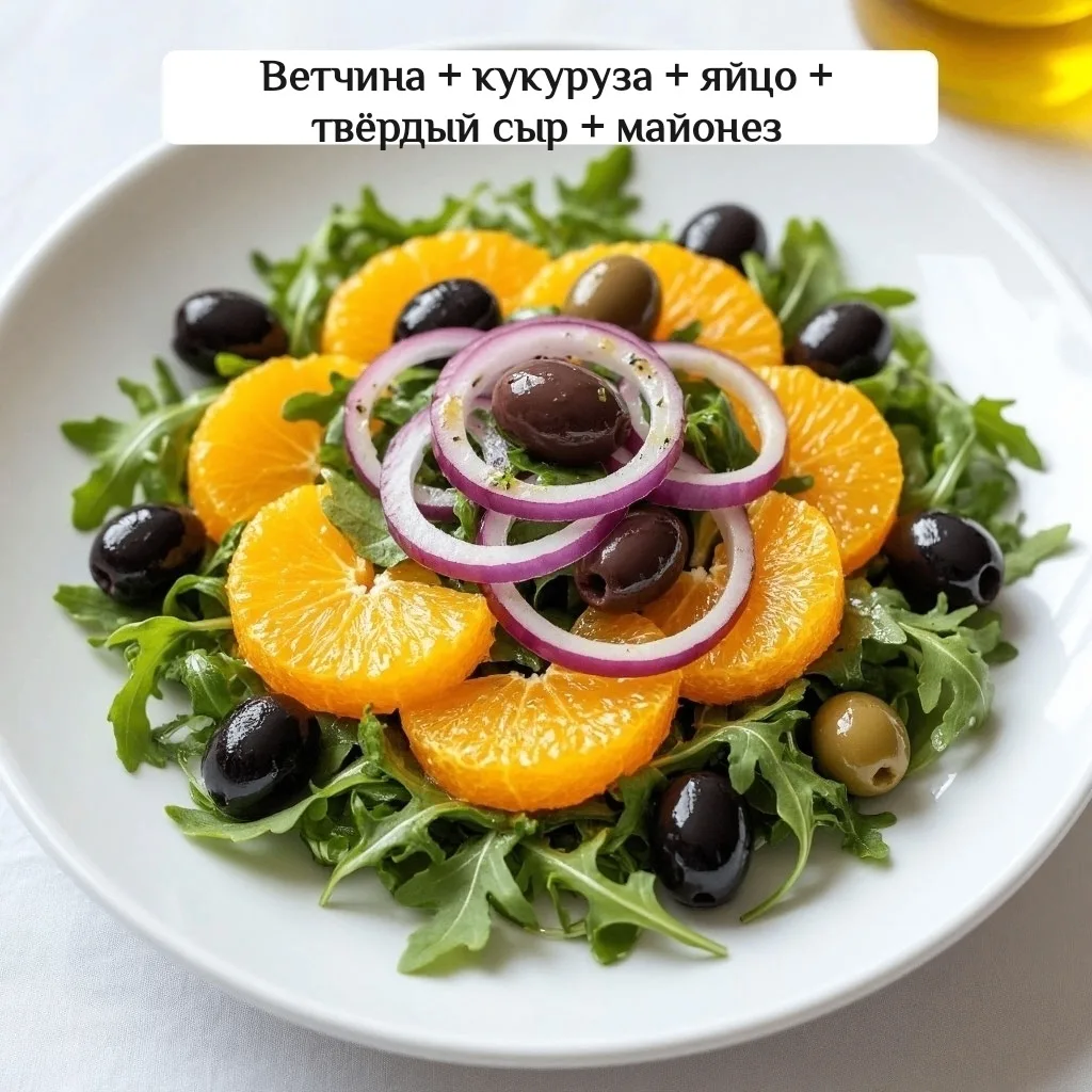 Апельсин + оливки + красный лук + руккола + оливковое масло.