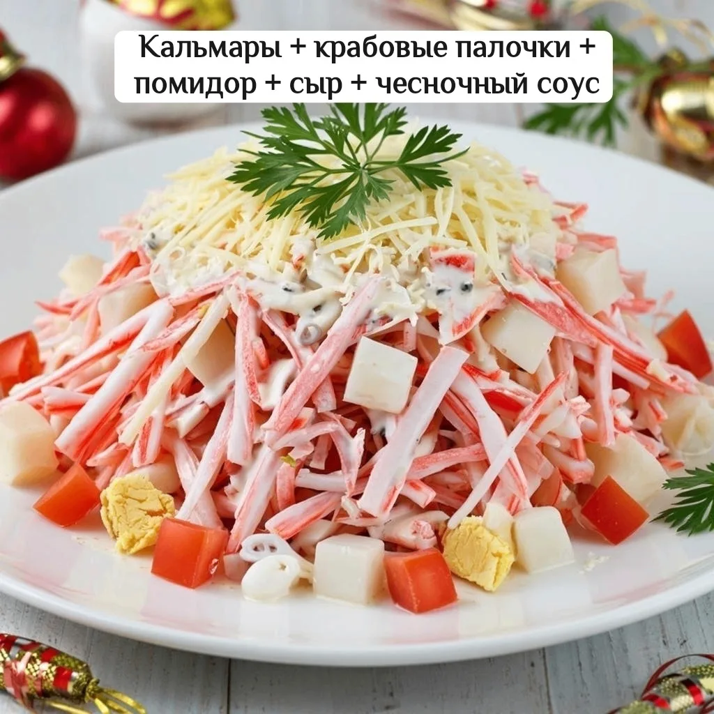 Кальмары + крабовые палочки + помидор + сыр + чесночный соус.