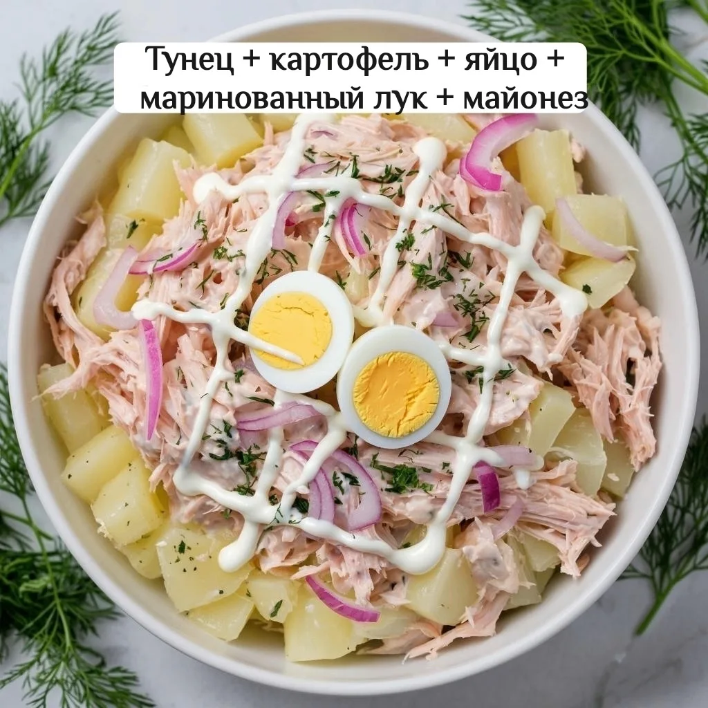 Тунец + картофель + яйцо + маринованный лук + майонез.