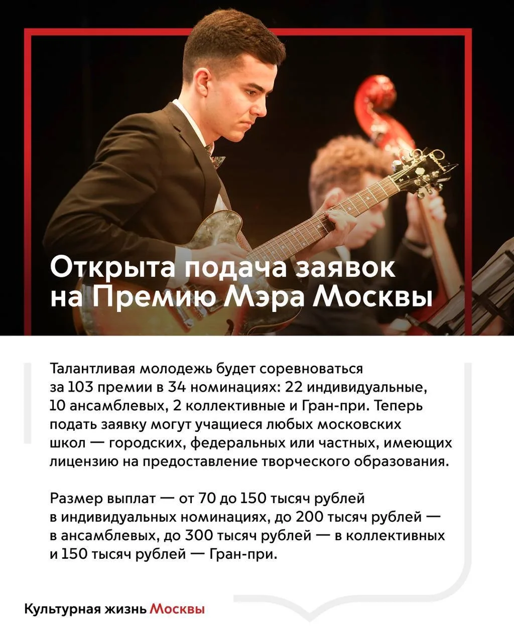 Продолжается приемная кампания на премию Мэра Москвы для молодых талантов — музыкантов, артистов и художников, обучающихся в детских школах и колледжах искусств. Одаренную молодежь ждут 103 награды с выплатами до 300 тысяч рублей.