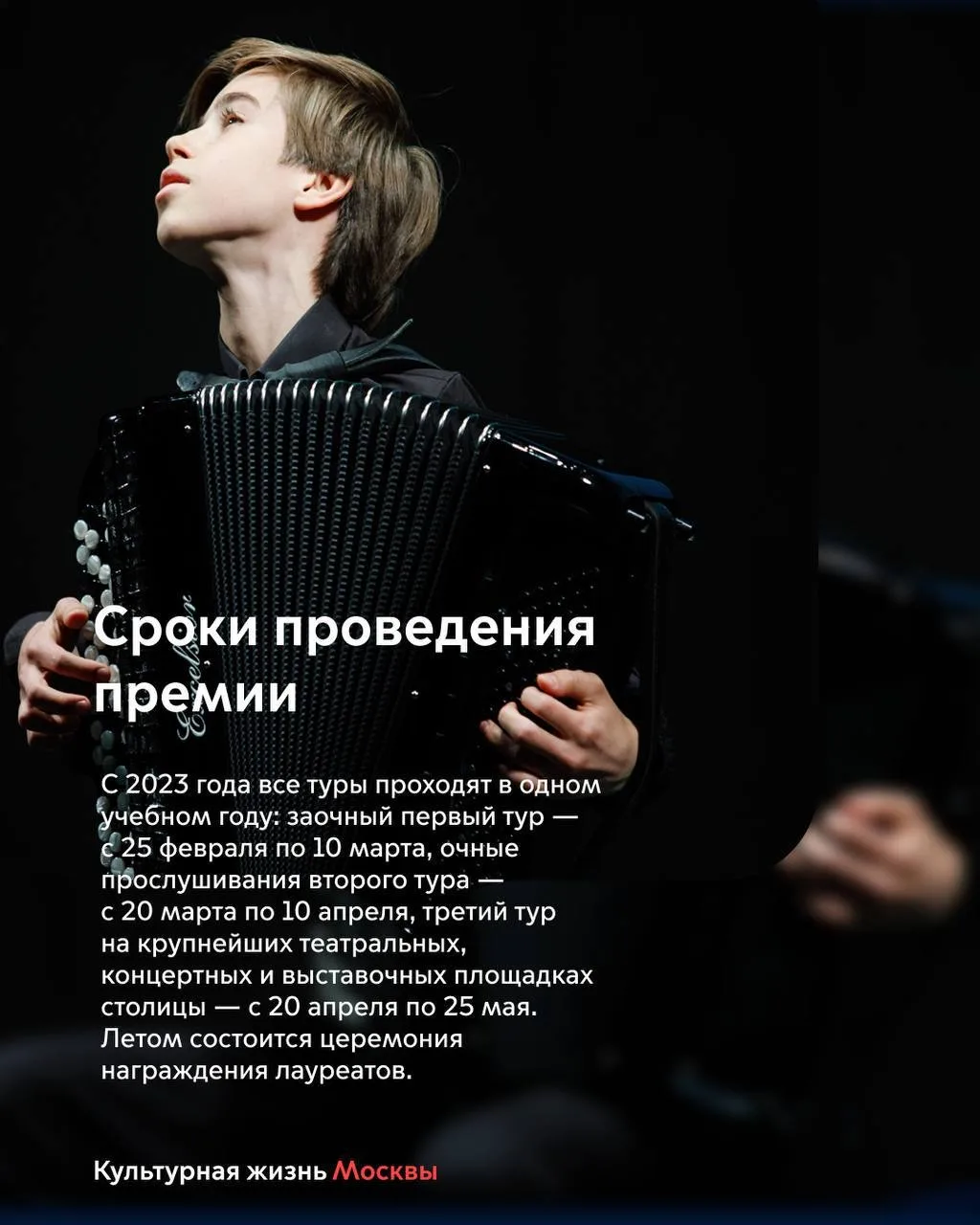 Очные прослушивания второго тура пройдут с 20 марта по 10 апреля. В рамках третьего этапа открытые выступления и выставки на лучших площадках столицы продлятся с 20 апреля по 25 мая. Экспертное жюри определит лауреатов в каждой из номинаций — торжественная церемония награждения пройдет с 30 мая по 5 июня.