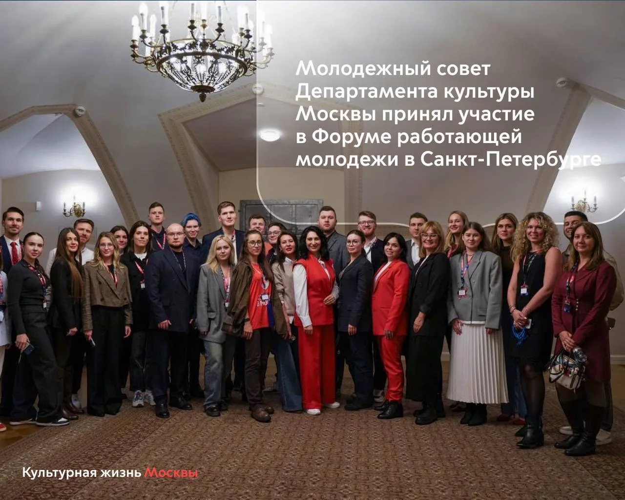 С 23 по 26 октября делегация Молодежного совета Департамента культуры города Москвы приняла участие в Форуме работающей молодежи в Санкт-Петербурге, в котором участвовали свыше 350 молодых специалистов и руководителей из разных регионов России.