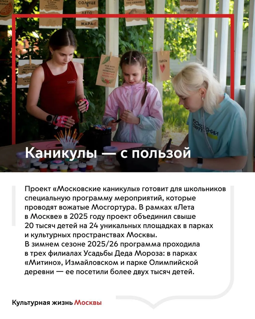 «Для москвичей и туристов подготовили насыщенную программу, в которую вошли интерактивные спектакли, концерты, мастер-классы, квесты, познавательные игры и экскурсии. Часть из них можно посетить уже сейчас», — рассказала заммэра Наталья Сергунина.