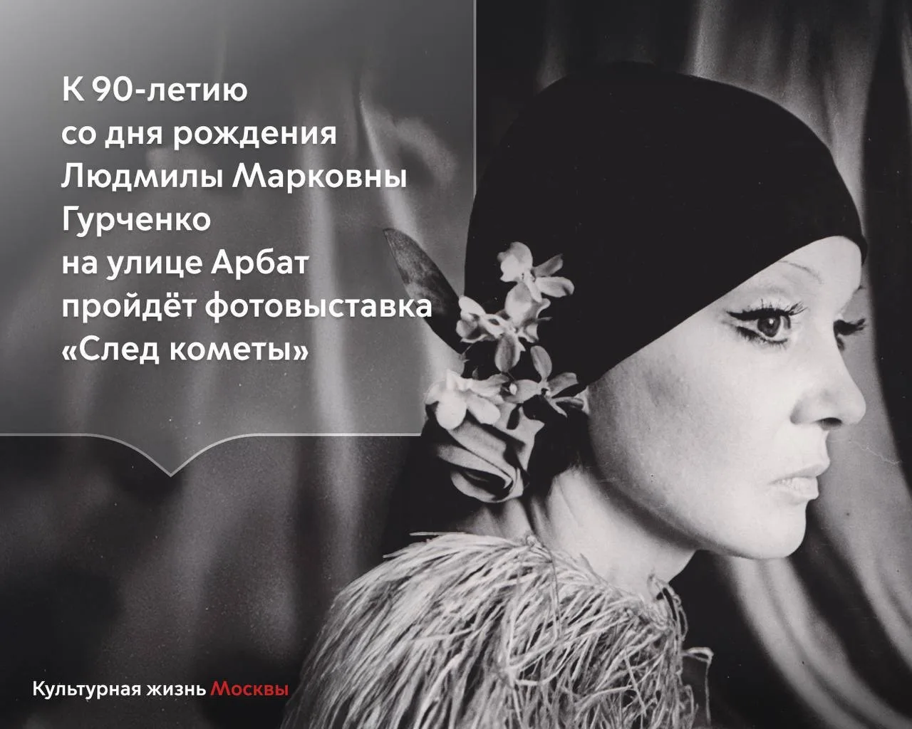 12 ноября исполняется 90 лет со дня рождения Людмилы Марковны Гурченко — великой актрисы, певицы и символа целой эпохи. В честь юбилейной даты на улице Арбат 14 ноября откроется фотовыставка «След кометы», включающая редкие и ранее не выставлявшиеся фотографии из семейного архива.