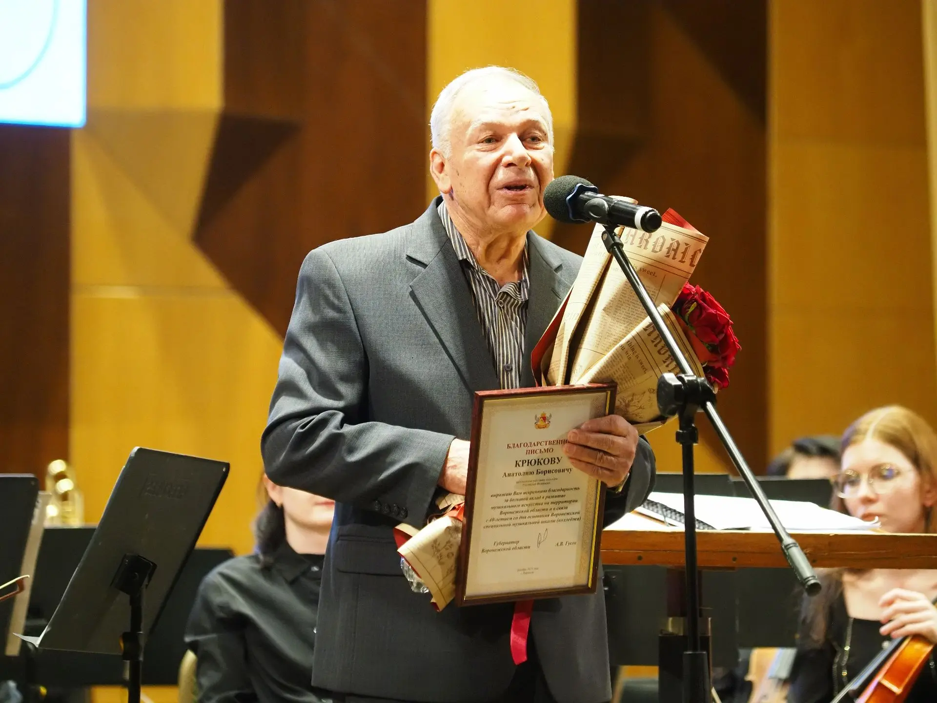 Министр культуры Воронежской области Мария Мазур передала благодарственное письмо от губернатора Александра Гусева основателю и первому директору школы Анатолию Крюкову, а также вручила благодарность главы региона коллективу учебного заведения — за большой вклад в развитие музыкального искусства региона.