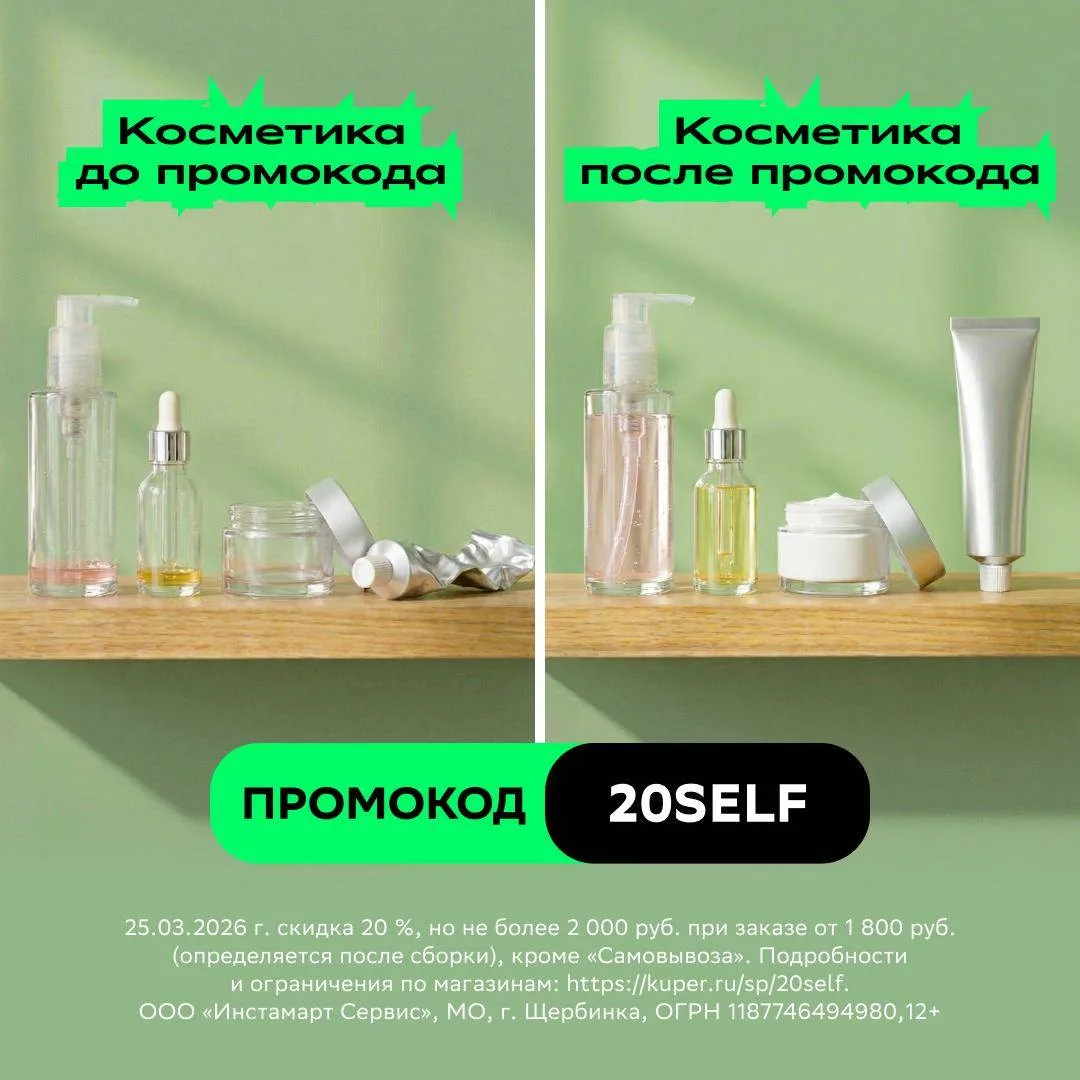 Пополняй запасы с промокодом 20SELF. С ним ты получишь скидку 20% на всё из магазинов косметики при заказе от 1 800 ₽ в Купере.⠀