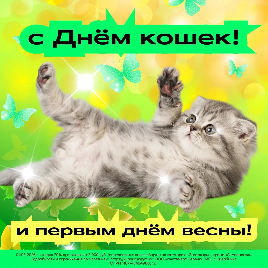 Хочешь — празднуй начало весны, хочешь — отмечай День кошек… Главное — не забудь виновниц торжества побаловать подарком 🎁 Тем более что по промокоду murr ты получишь скидку 20% при покупке зоотоваров на сумму от 3 000 ₽. Всё продумано.