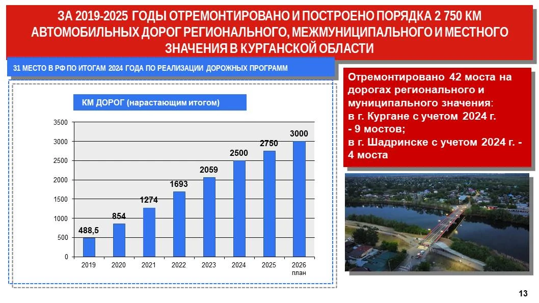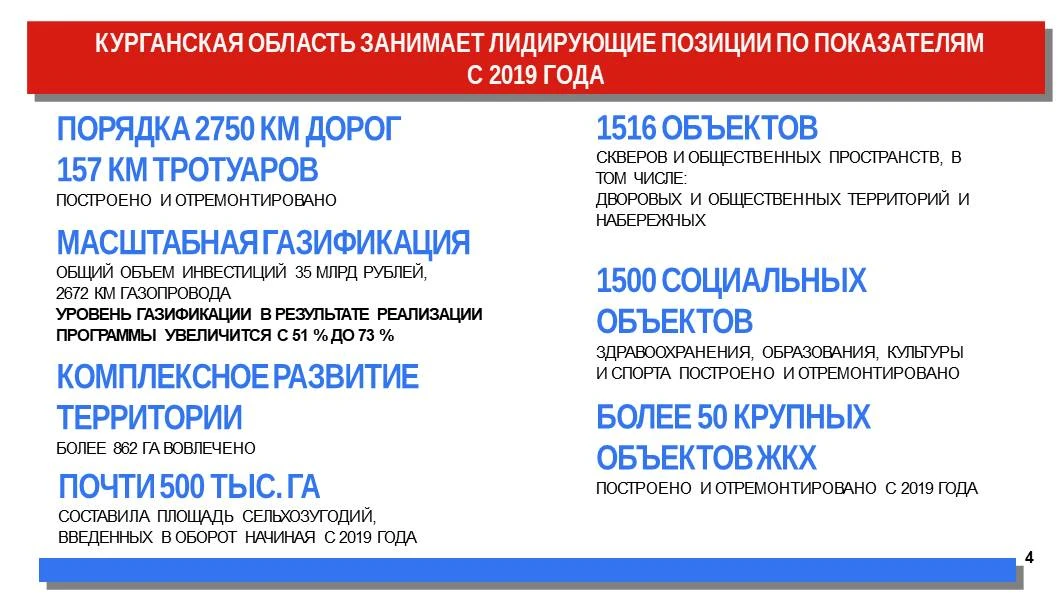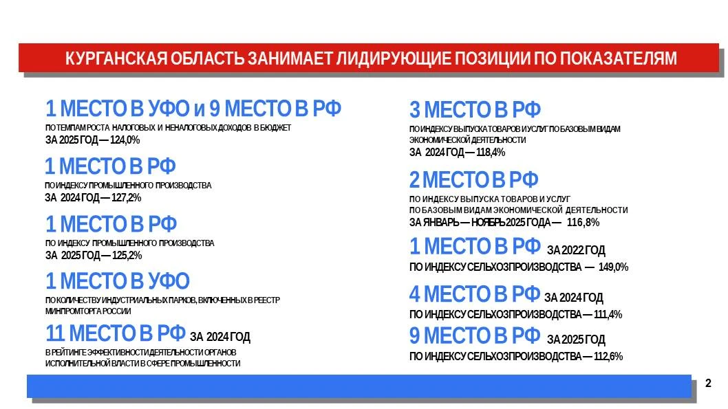 Глава региона подчеркнул, что всего за 7 лет Курганская область из символа депрессии превратилась в символ быстрого роста и развития, заняв лидерские позиции в стране по ключевым социально-экономическим показателям, включая 1-е место по темпам роста промышленного производства в 2024 и 2025 годах, 4-е место в стране по темпам роста сельскохозяйственного производства по итогам 2024 года, 9-место в 2025 году и 8-е место по итогам января 2025 года по росту собственных доходов бюджета, тысячи построенных и отремонтированных социальных объектов, километров дорог, объектов благоустройства, в два раза рост объемов ввода жилья, рост в ИТ-сфере, снижение в 39 раз до рекордных 0,2% безработицы, и многие другие успехи.
