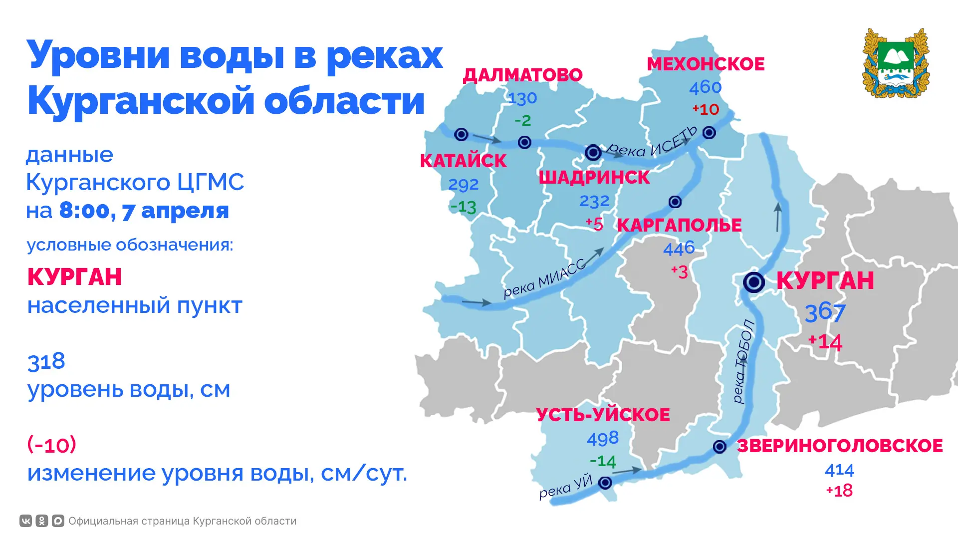 Данные Курганского ЦГМС по уровням воды в реках региона на 8:00 8 апреля.