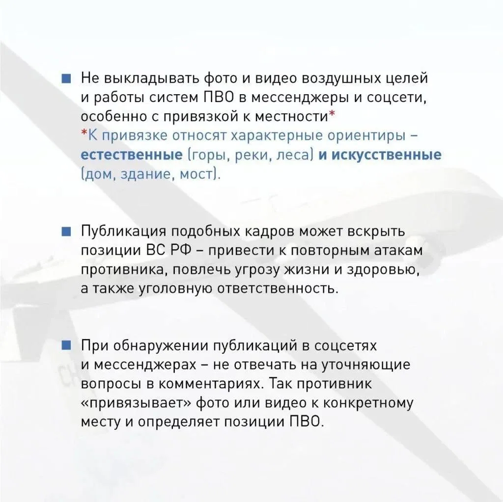 ✅Не выкладывайте фото или видео БПЛА, работы систем ПВО, работы специальных и оперативных служб в соцсети. Противник может использовать эту информацию для корректировки
