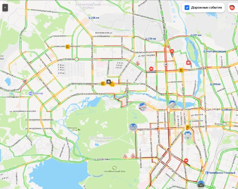 Особенно трудно проехать в центре города. Заторы образовались на улицах Доватора, Тимирязева, Лесопарковая, Елькина, Образцова, Курчатова, Блюхера, Худякова, Воровского, Свободы, Доватора, Цвиллинга, Энгельса, Труда, Свердловском проспекте и проспекте Ленина.