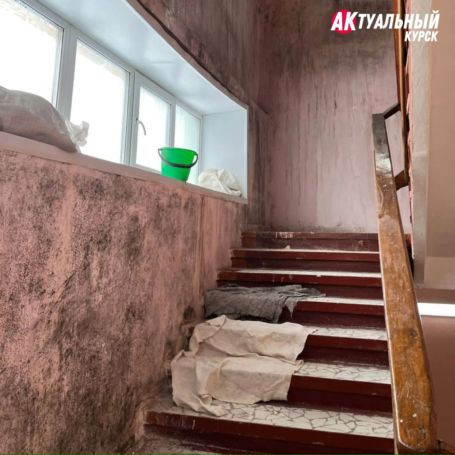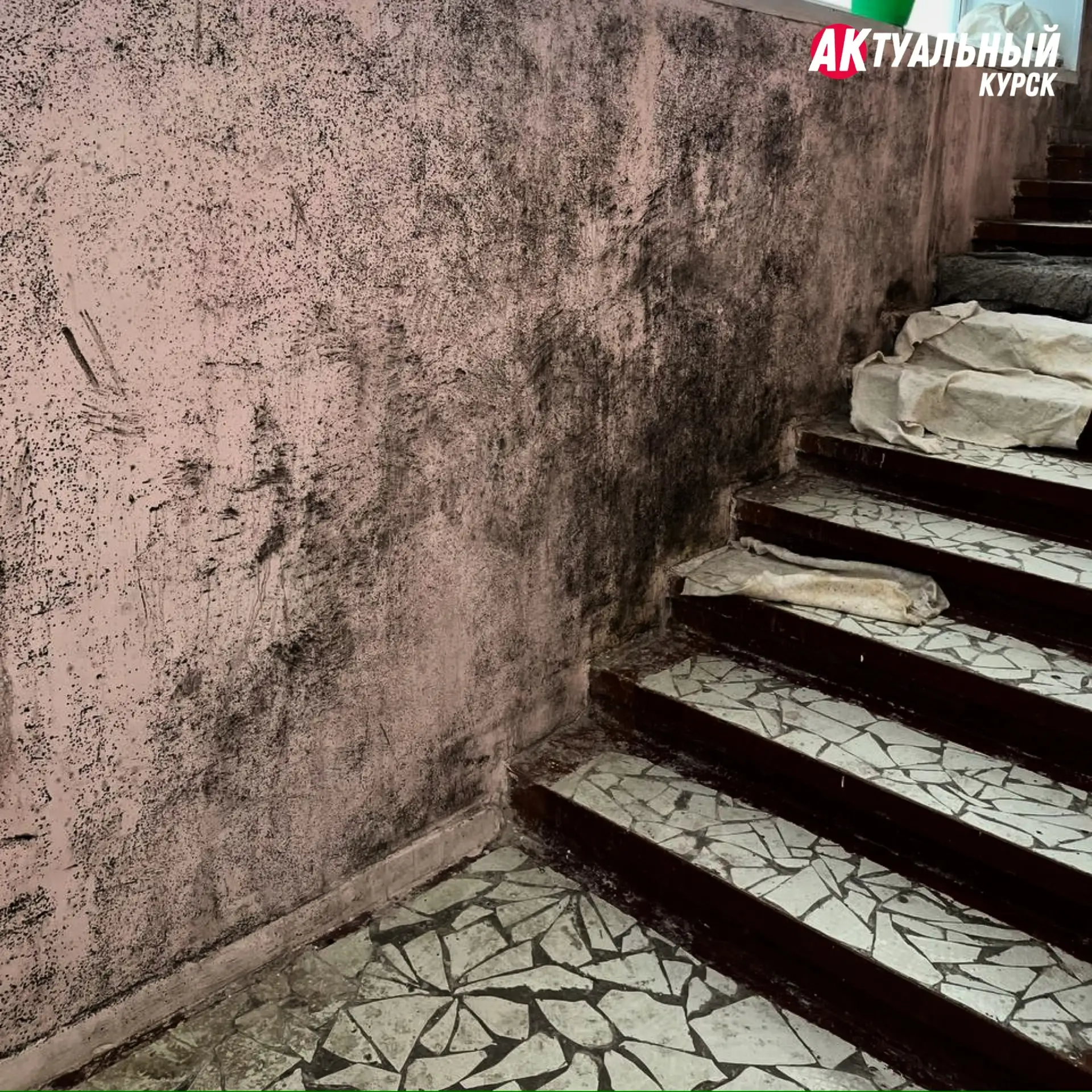 ‼️ В плесень покрылась лестница в лицее №3 города Курчатова в Курской области.