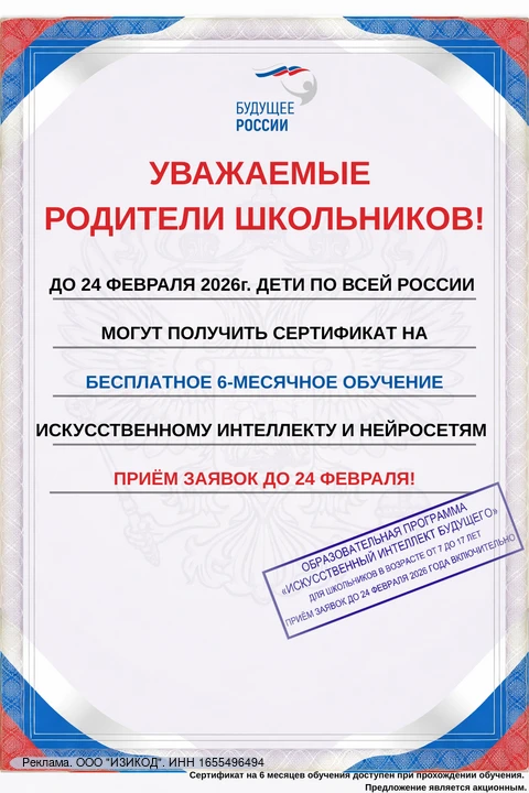 🎓До 24 февраля каждый ребенок в возрасте от 7 до 17 лет может получить сертификат на 6 месяцев бесплатного обучения искусственному интеллекту и нейросетям.