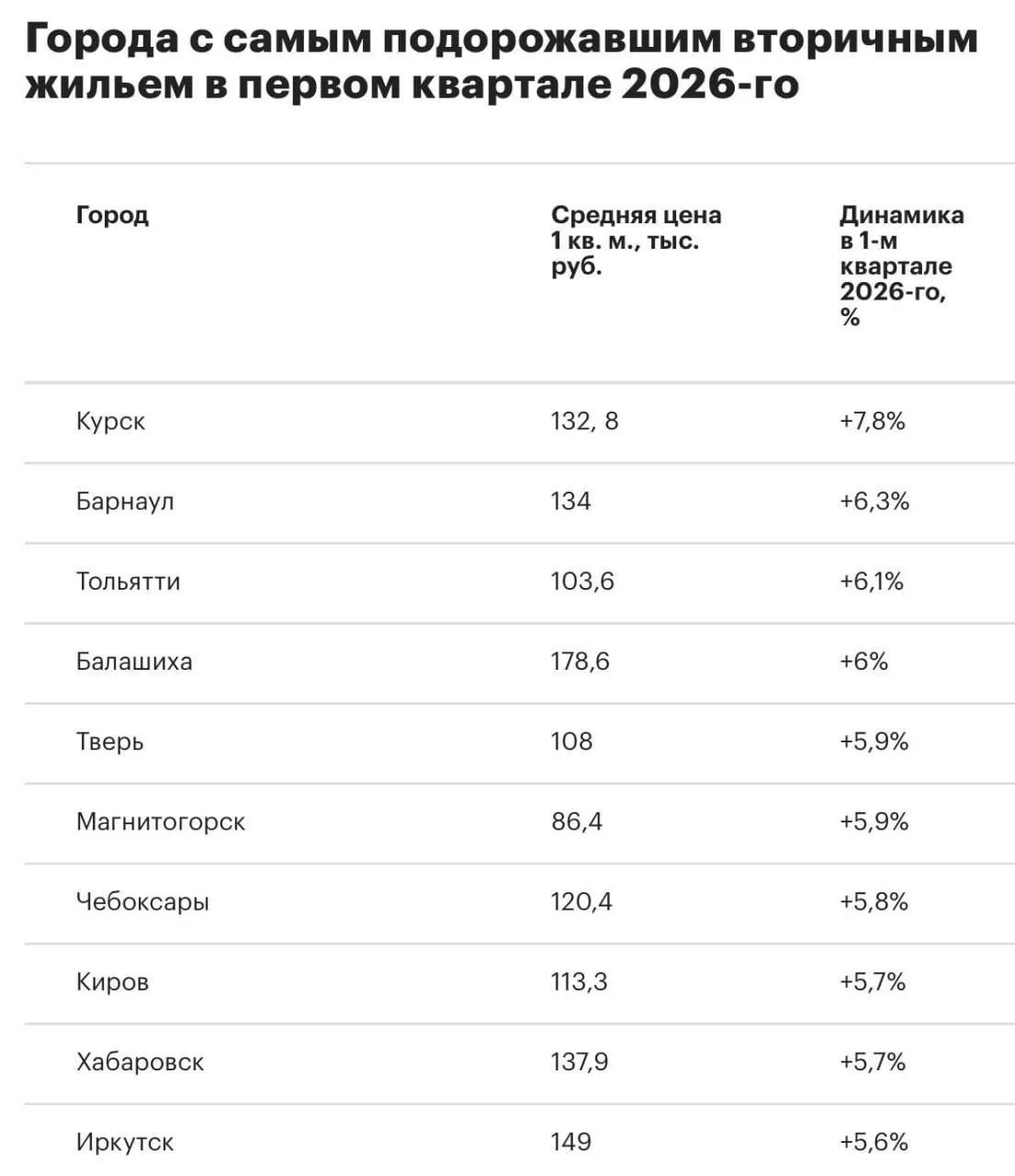 В первом квартале этого года стоимость на «вторичку» выросла в 48 из 50 крупных городов, а лидером по росту на 7,8% стал Курск.