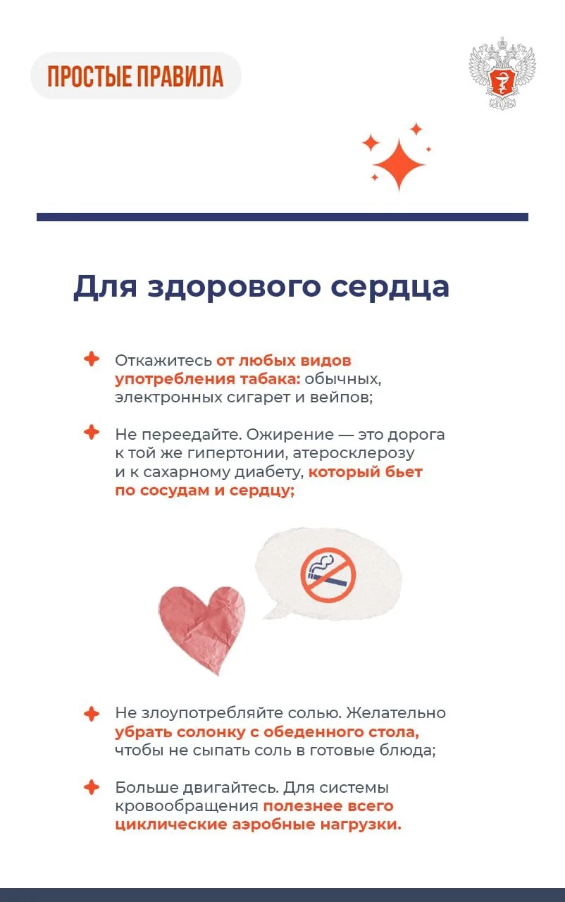 Для здоровья сердца рекомендуется отказаться от употребления табака, переедания и злоупотребления солью. Старайтесь больше двигаться.
