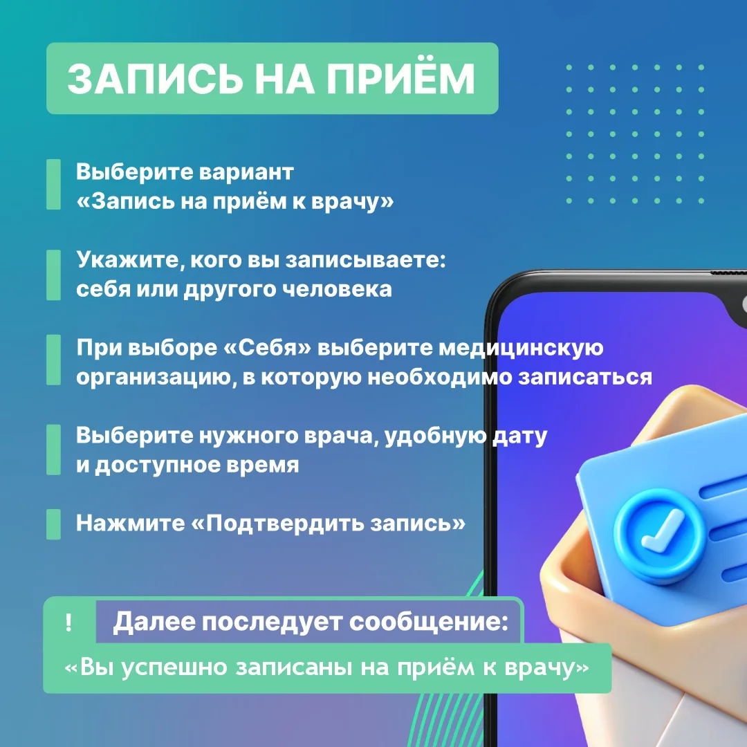 Сервис поможет записать на прием к врачу себя или другого человека за несколько минут, отменить свою запись, если планы изменились. Можно записаться на телемедицинскую консультацию, чтобы без личного визита закрыть больничный лист или скорректировать лечение.