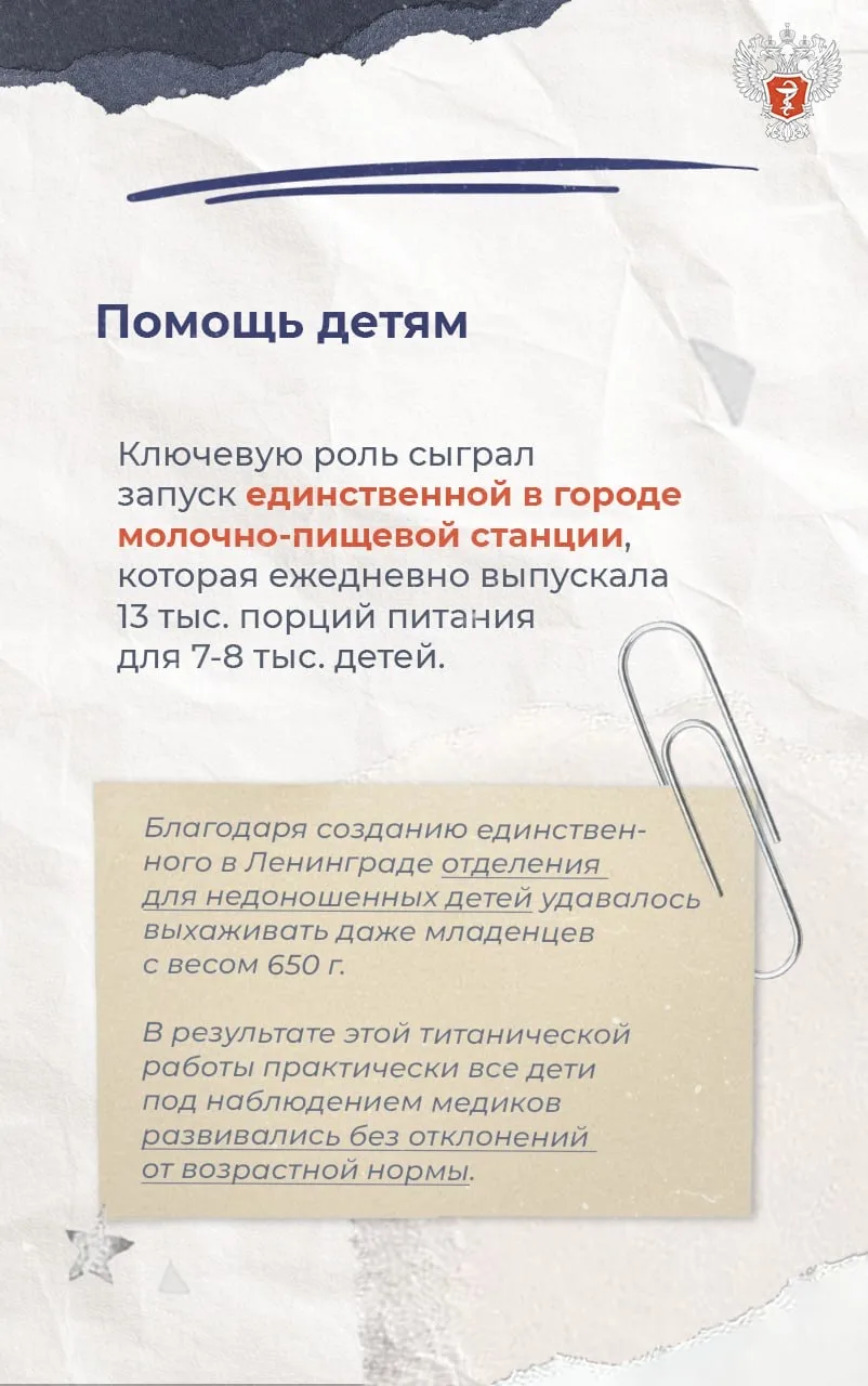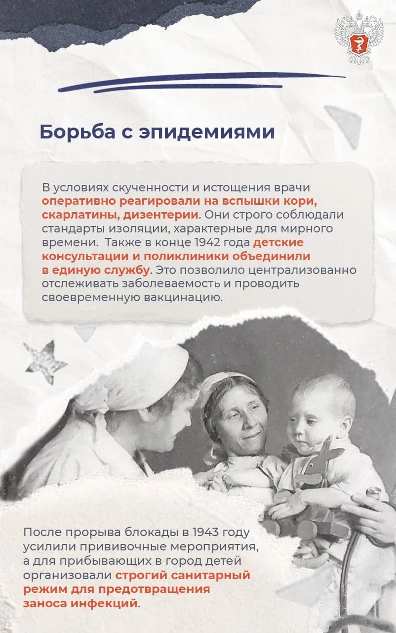 ❤️🩹 В результате уже к 1944 году младенческая смертность практически вернулась к довоенному уровню. Ленинградской медицине удалось предотвратить кризис, который мог привести к неконтролируемым эпидемиям и массовой гибели населения.