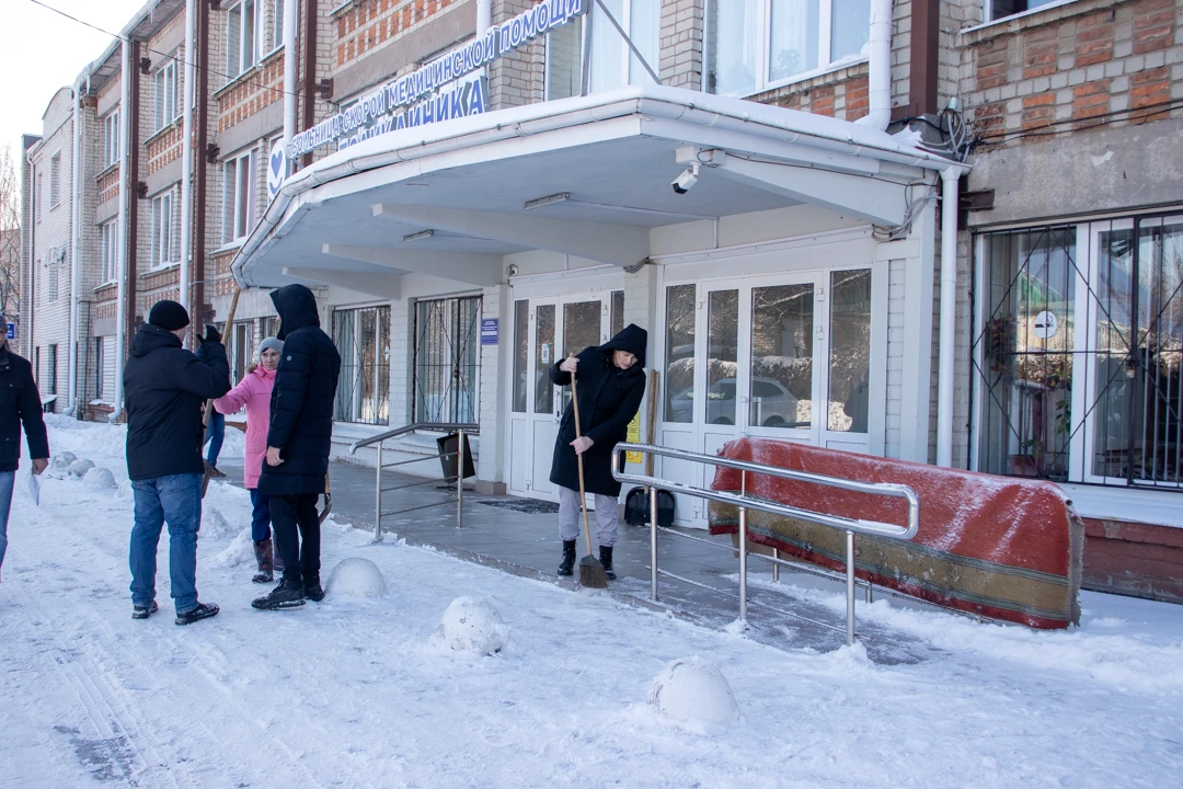 ❄️ Утро в ОБУЗ «КГКБСМП» началось с полезного дела на свежем воздухе!