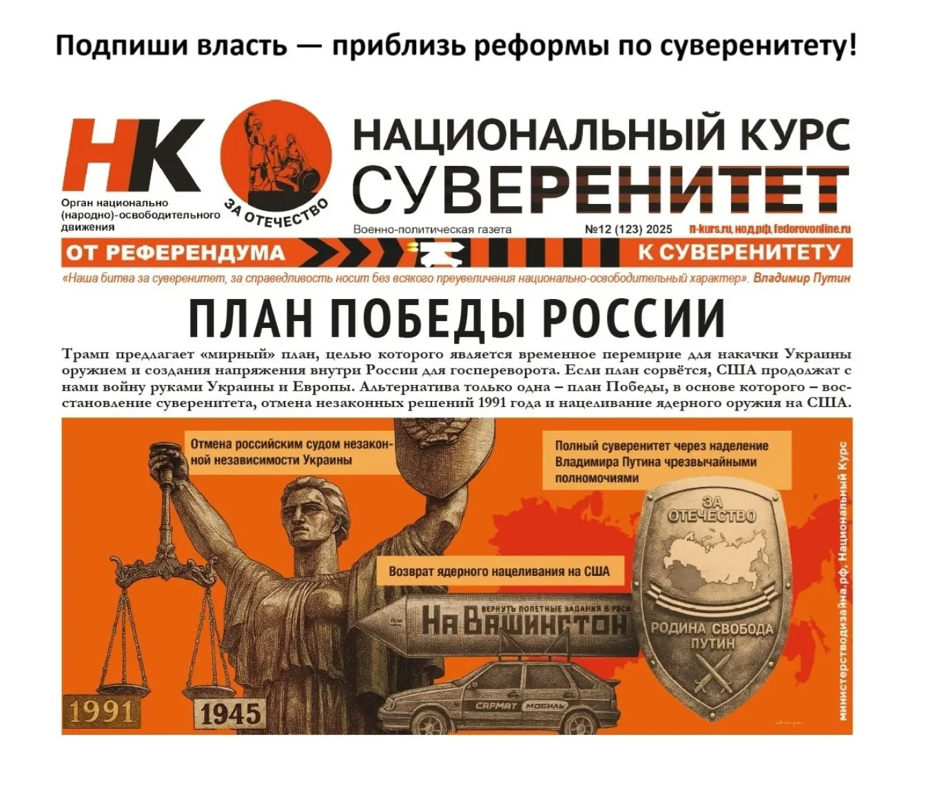 Для легализации Национально-освободительного движения в России, для продвижения реформ по суверенитету — тема борьбы за свободу и независимость Отечества должна стать номером один. Для этого максимальное количество чиновников и представителей СМИ должны быть оповещены о нашей повестке и о возможных последствиях противодействия курсу Владимира Путина на безусловный суверенитет народа.