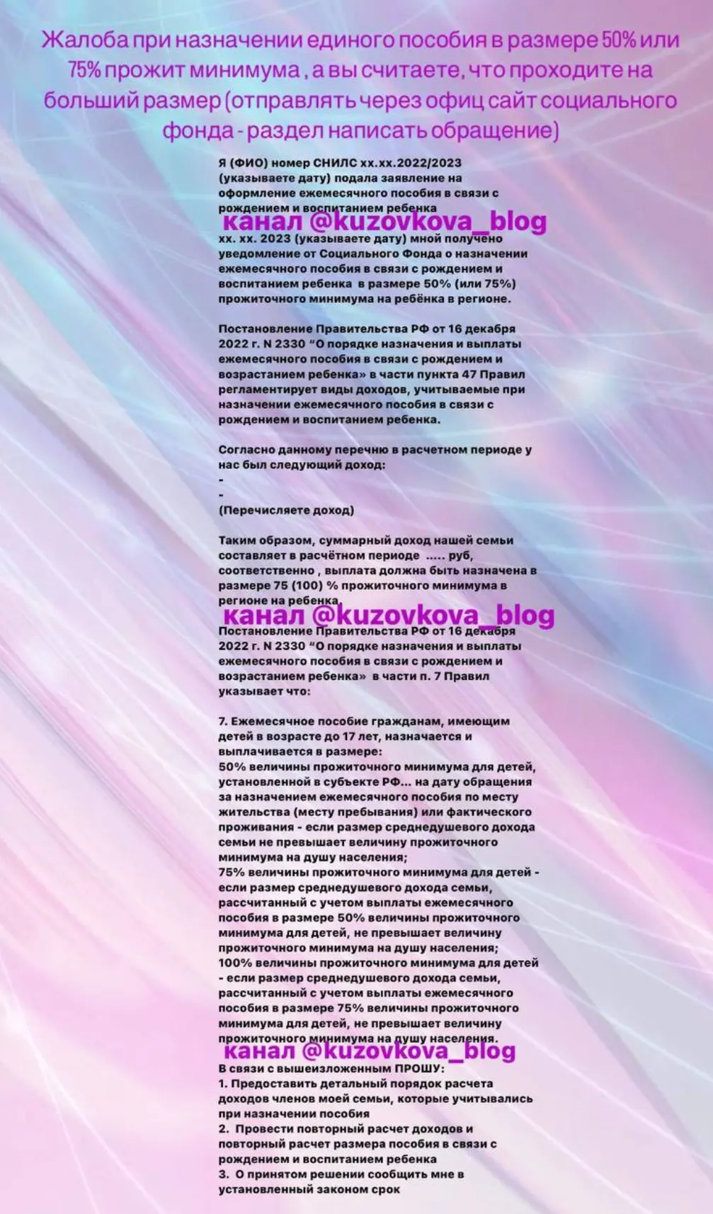 ‼️Жалоба, если единое пособие назначили в размере 50% или 75% прожит минимума , а вы считаете, что проходите на больший размер