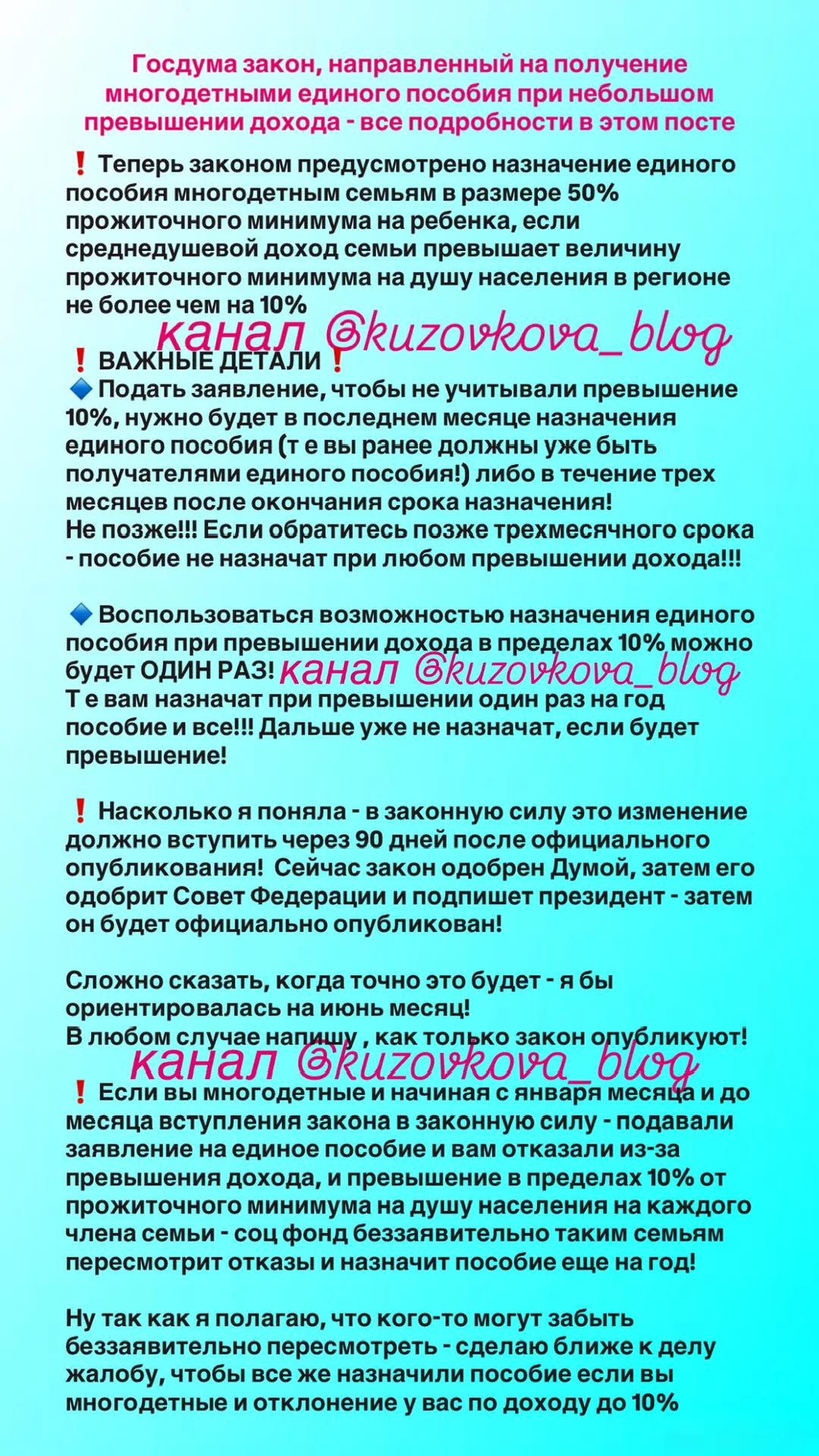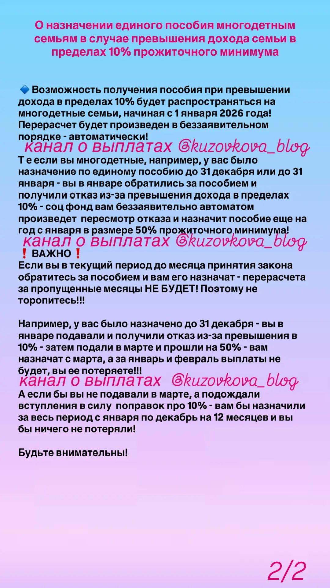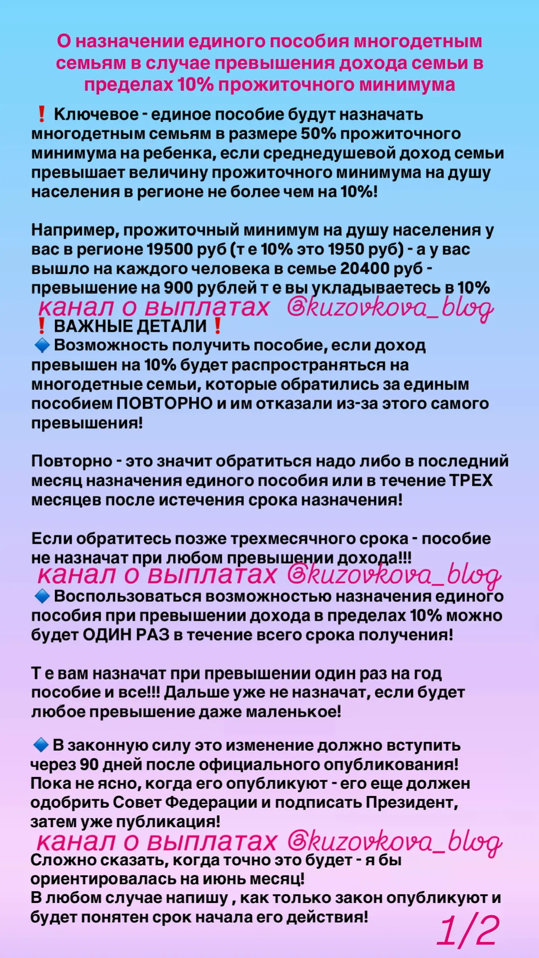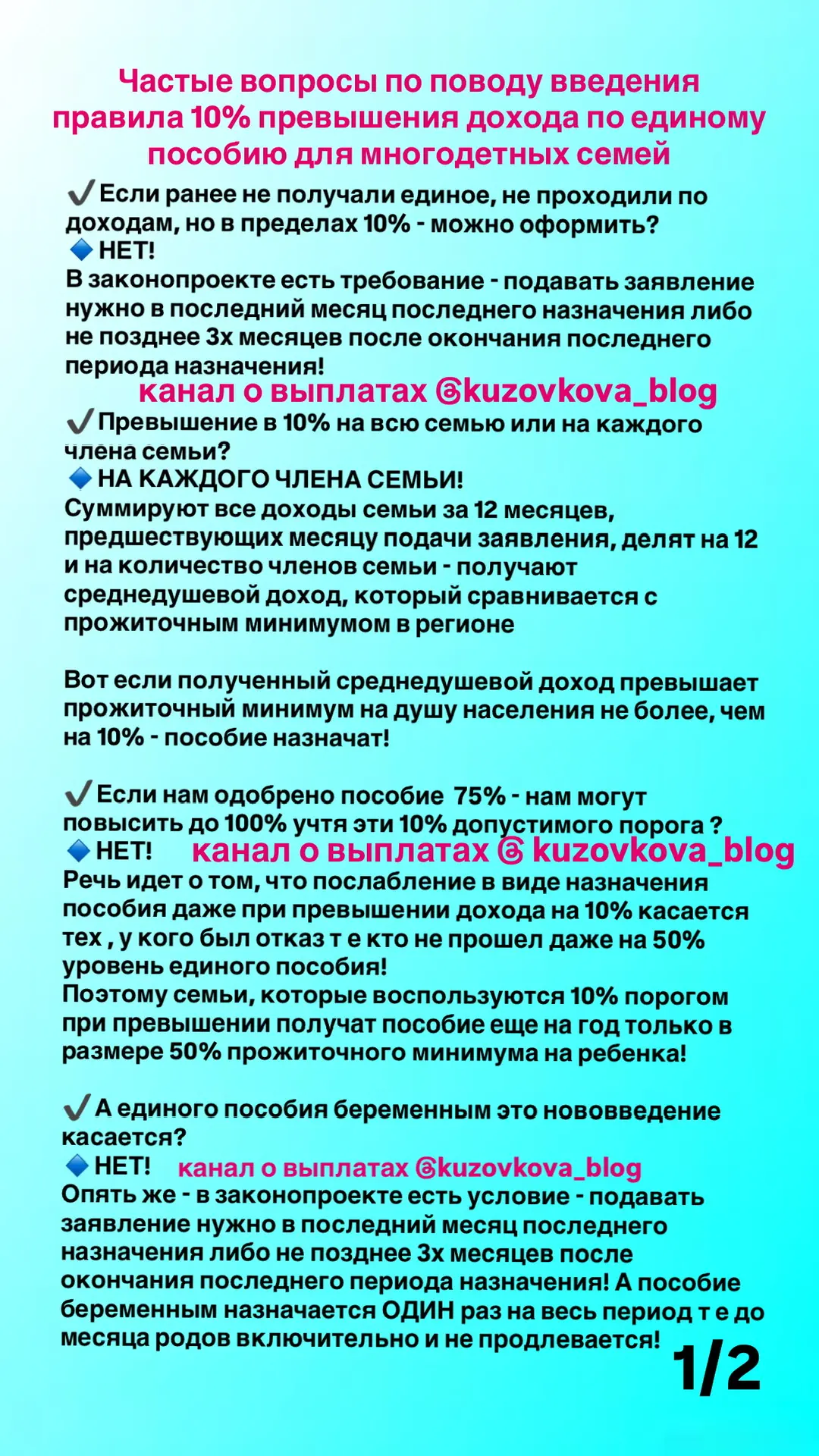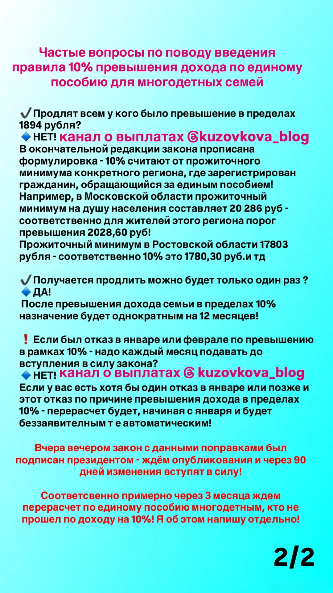 ‼️Частые вопросы по поводу введения правила 10% превышения дохода по единому пособию для многодетных семей👆🏻