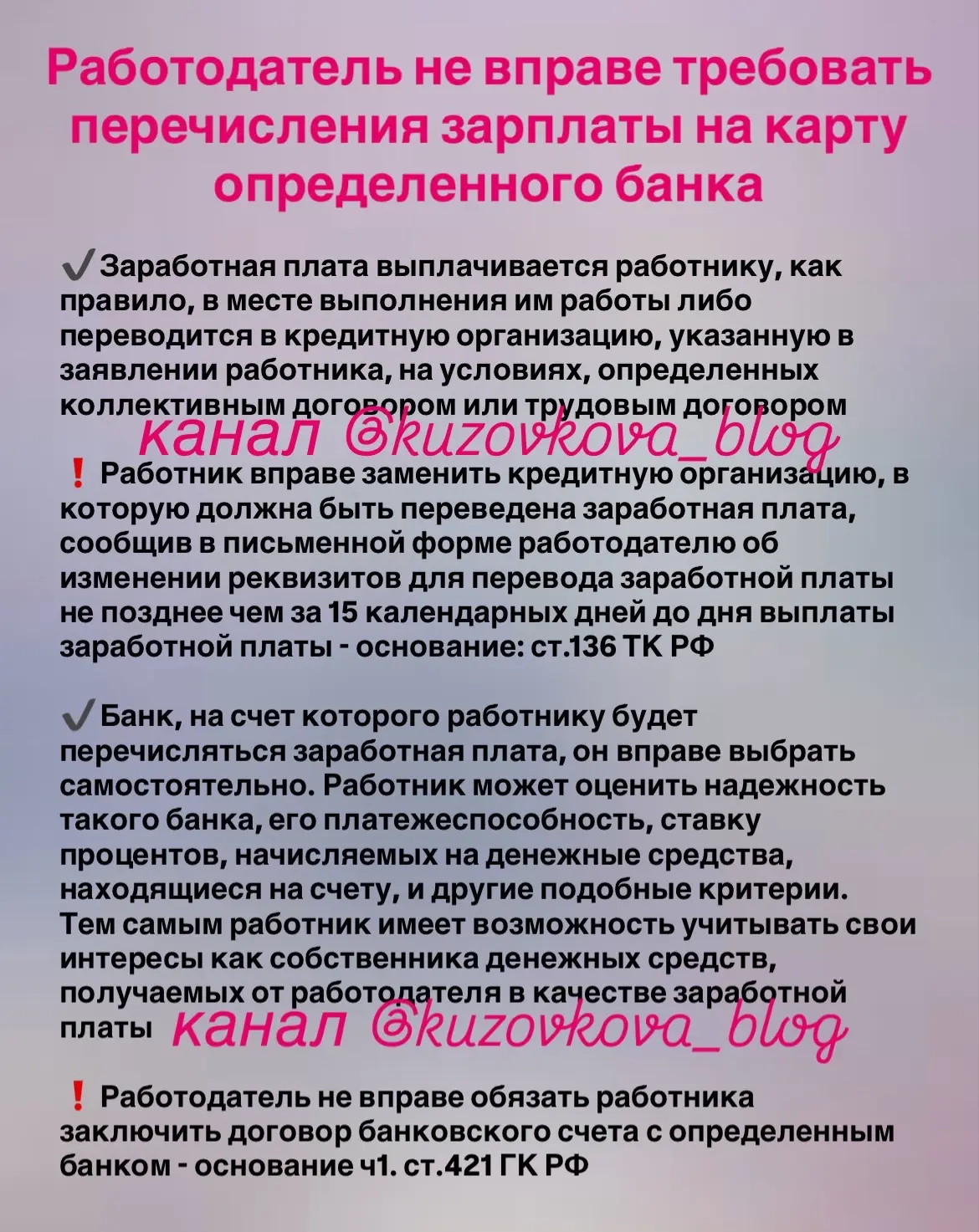 ‼️Работодатель не вправе требовать перечисления зарплаты на карту определенного банка👆🏻