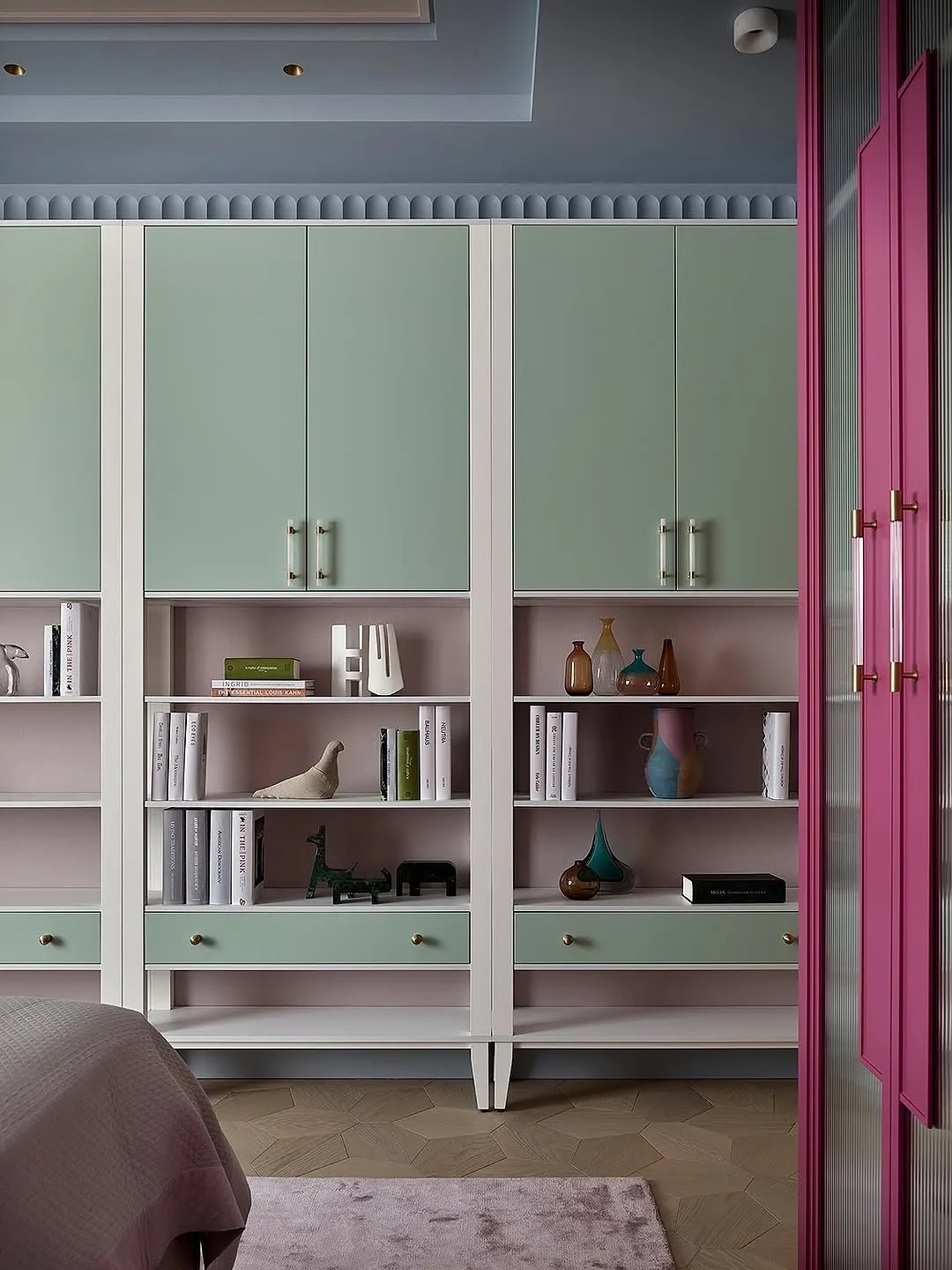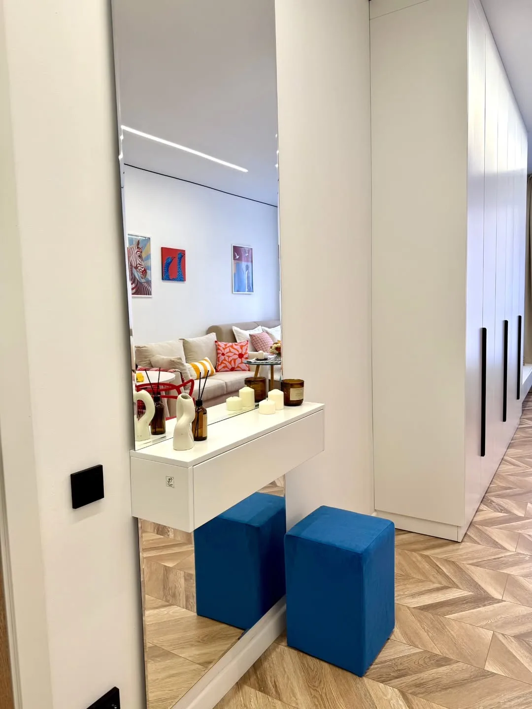 Такое решение помогает увеличить хранение и визуально вытянуть помещение.