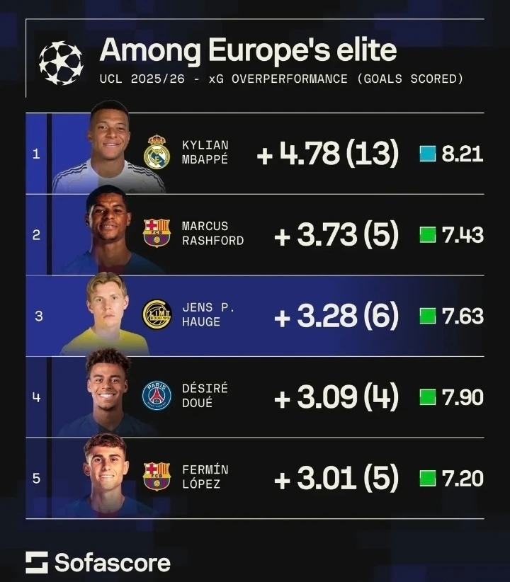 Согласно модели XG, Килиан Мбаппе забил в Лиге чемпионов в этом сезоне почти на пять мячей больше, чем ожидалось.