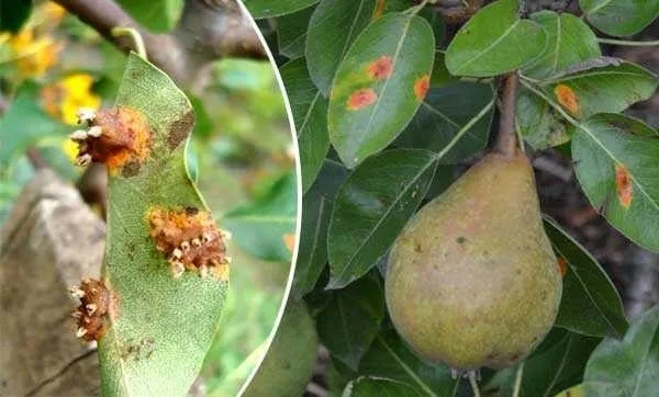 Проявляется ржавчина обычно в июле-августе оранжевыми и красными пятнами на листьях, которые становятся бугристыми и опадают раньше времени. Дальнейшее заражение дерева проявляется наростами и потрескавшейся корой.
