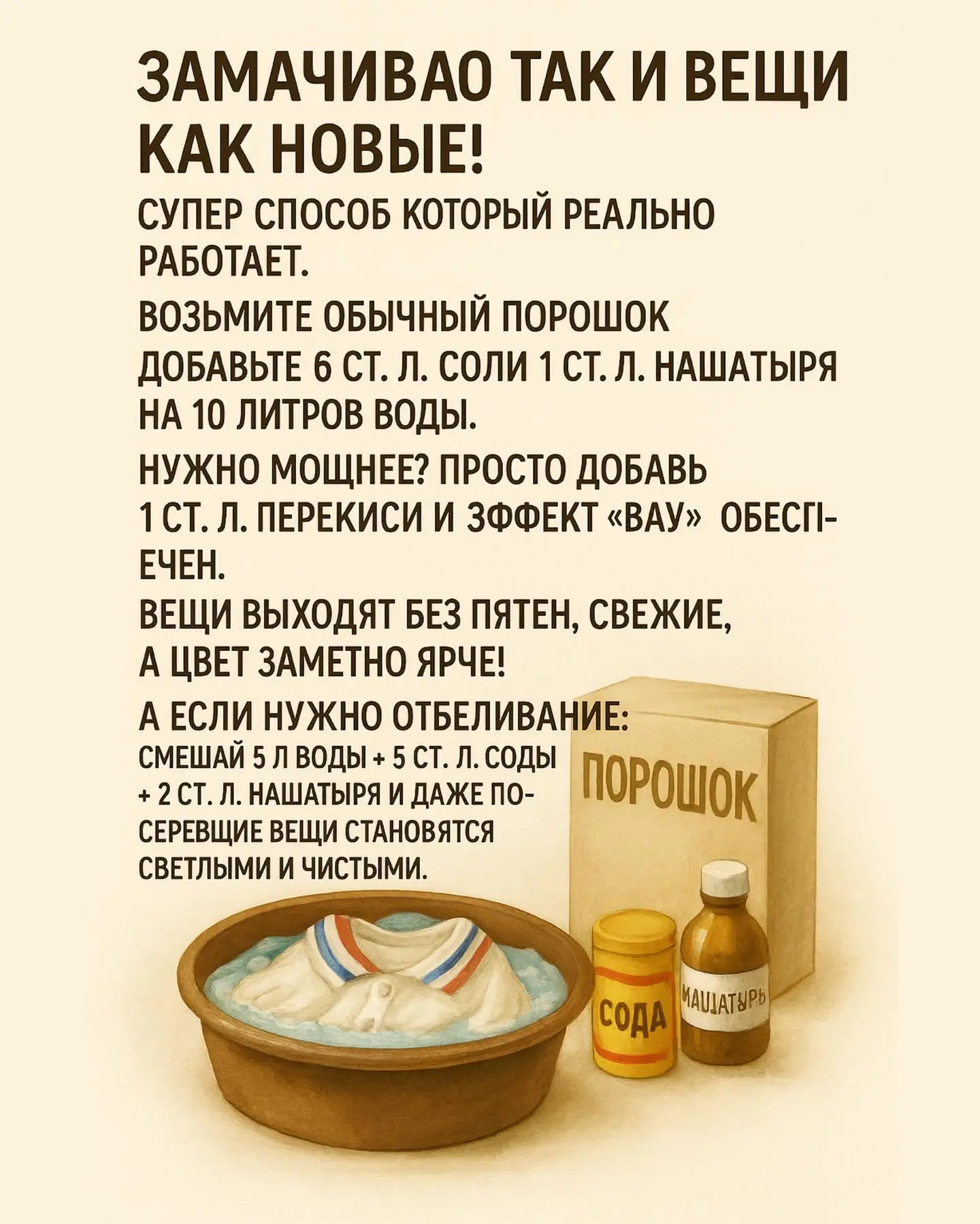 Сода + нашатырь мягко поднимают серый налёт, и даже «утомлённые жизнью» вещи становятся светлыми и ровными по цвету.