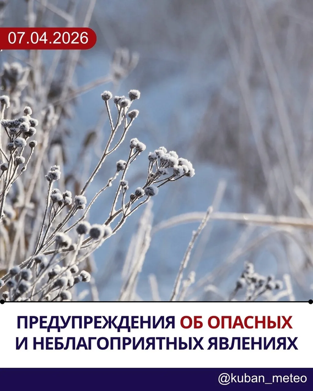 - Во второй половине ночи и утром 08.04.2026, ночью и утром 09.04.2026, 10.04.2026 и 11.04.2026 местами (кроме Черноморского побережья от Анапы до Магри, г. Сочи и Сириус) ожидаются заморозки в воздухе и на почве -1…-3° (опасное явление).